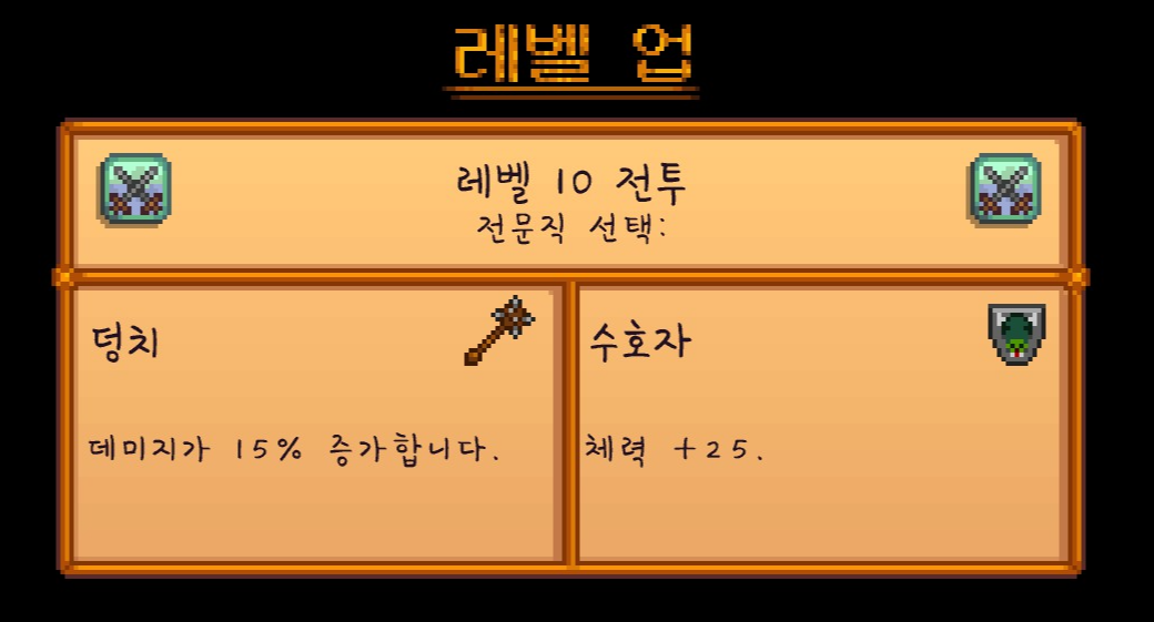 동굴에서 신나게 싸우다 보니 전투 10레벨을 달성하게 되었는데요. 어차피 체력은 음식이 해결해 주기 때문에 대미지 15% 올려주는 '덩치'를 선택했습니다.
