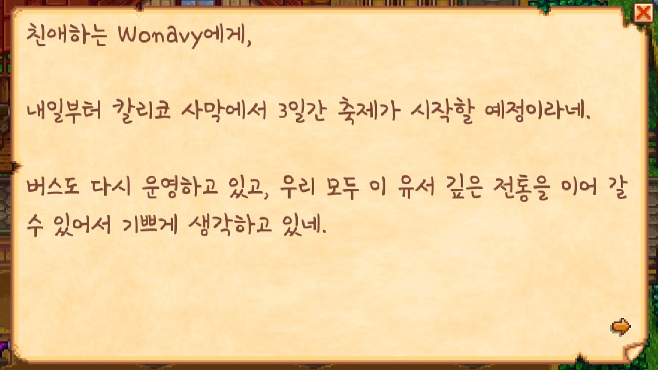 그리고 마을 이리저리 상호작용을 하다가 '칼리코 달걀'이라는 것을 얻을 수 있었는데요. 이게 사막 축제에서 통용되는 주화입니다.