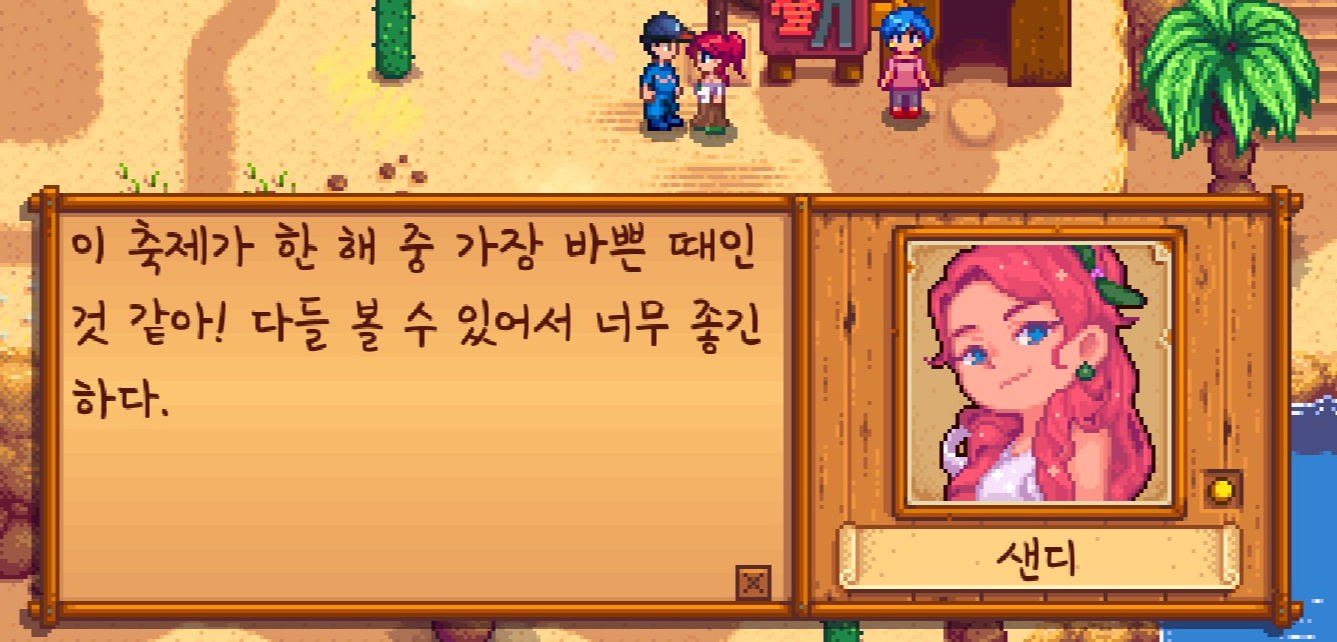 샌디도 다른 축제에서는 볼 수 없었는데, 이번 사막 축제로 다른 마을 NPC와 함께 볼 수 있게 됐네요.