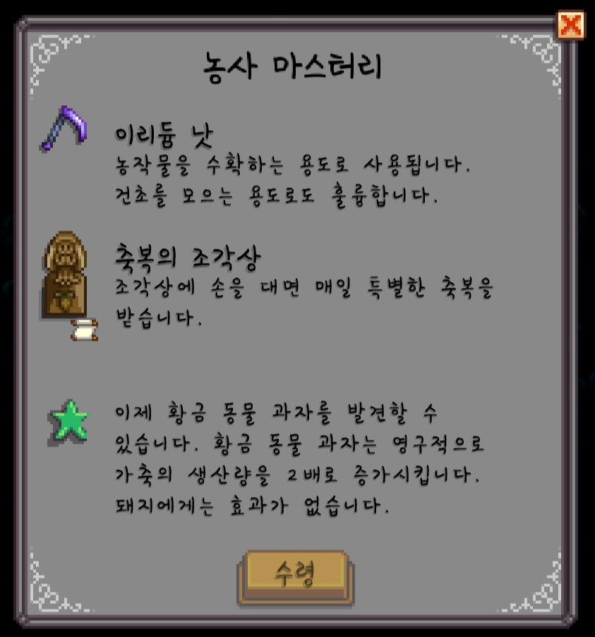이거 때문에 낫 수확 모드를 빼고 1.6 시작을 했는데, 농사 마스터리를 가장 먼저 선택해보려고 합니다.