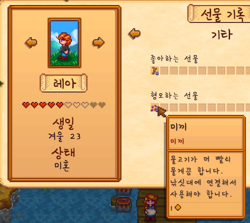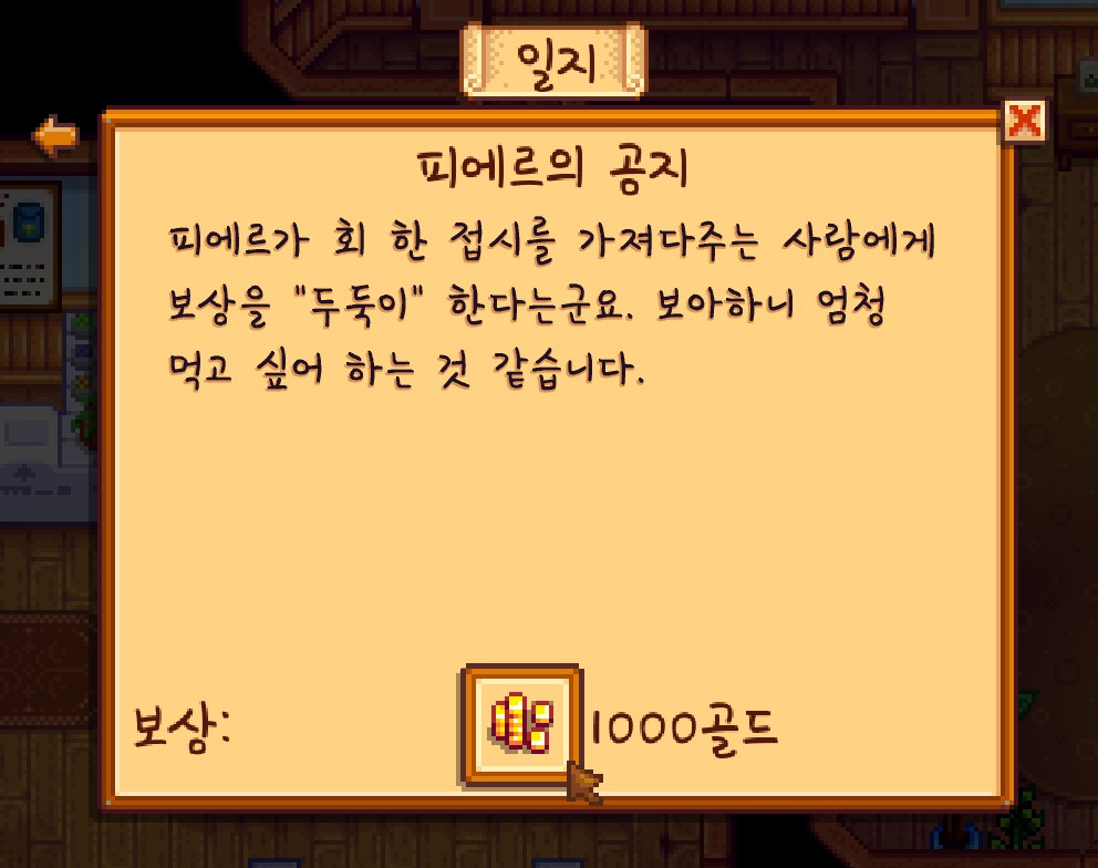 피에르에게 회를 가져다주니 1000골드를 얻을 수 있었는데요. 회 하나 75골드인 것을 생각하면 진짜 두둑하게 챙겨주긴 했네요.