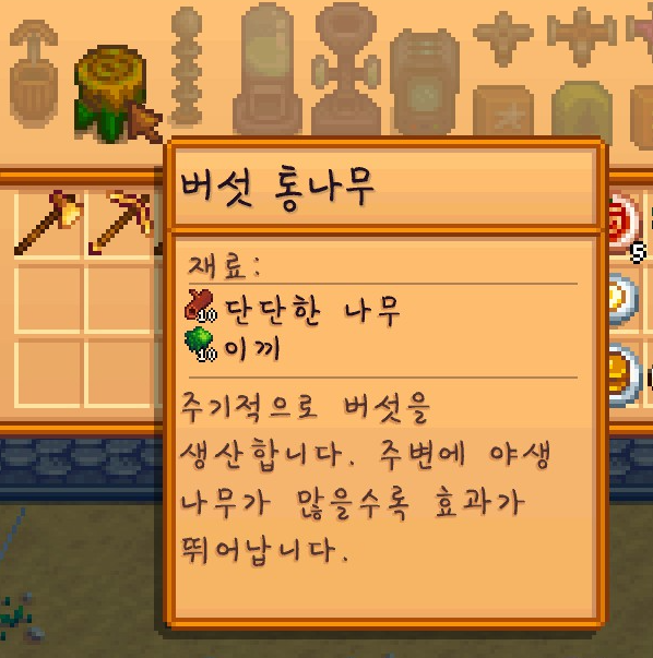 새로운 제작 아이템이 더 있나 싶어서 찾아보다가 '버섯 통나무'를 발견할 수 있었는데요. 주기적으로 버섯을 생산한다고 하더라고요?