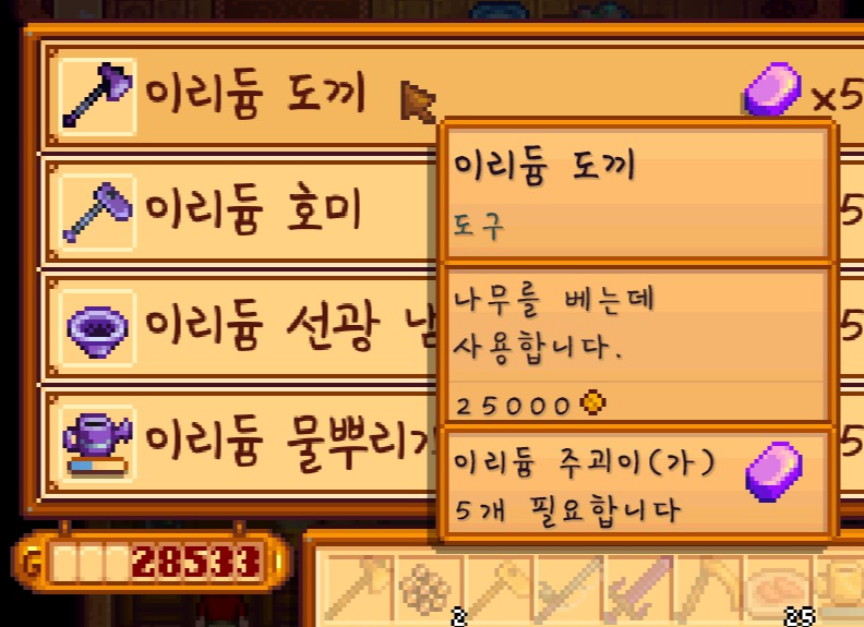 바로 도끼 업그레이드 의뢰를 맡겼습니다. 이리듐 도끼로 업그레이드 하면 나무를 쉽게 벨 수 있기 때문이죠.