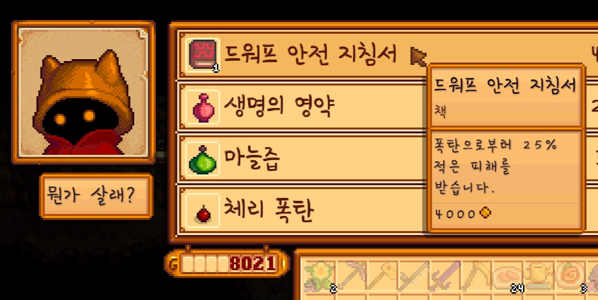 드워프를 찾아가면 이렇게 광산 관련 물품들을 돈을 주고 구매를 할 수 있는데요.