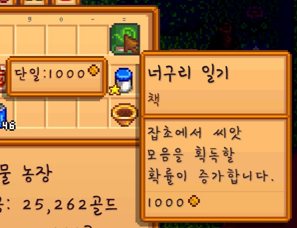패시브 책을 하나 받을 수 있었는데요. 잡초를 베면 씨앗 모음을 얻을 확률이 증가한다고 하네요.