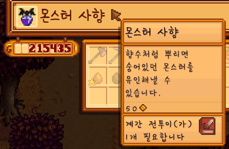 몬스터 사향이 숨어있던 몬스터를 유인할 수 있다고 하는데... 뭔가 어딘가 쓰일 것 같아서 일단 사용하지 않고 가지고 있기로 했습니다.