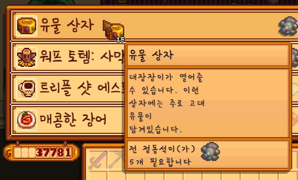 그리고 전 전동석은 전부 유물 상자로 바꿔줬습니다. 아직 유물을 다 못 채웠더라고요?