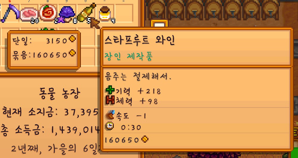 스타후르츠 와인을 지금 그대로 가져다 팔아도 16만 골드라는 어마어마한 가격이 나오기 때문에 포기할 수가 없더라고요.