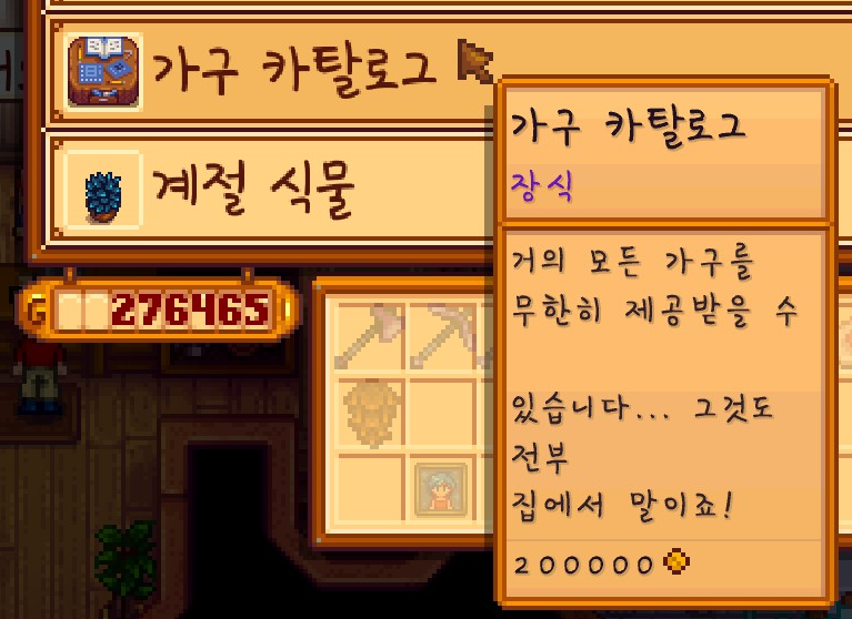 바로 피에르의 잡화점에 들러서 '카탈로그'와 '가구 카탈로그'를 구매했습니다.