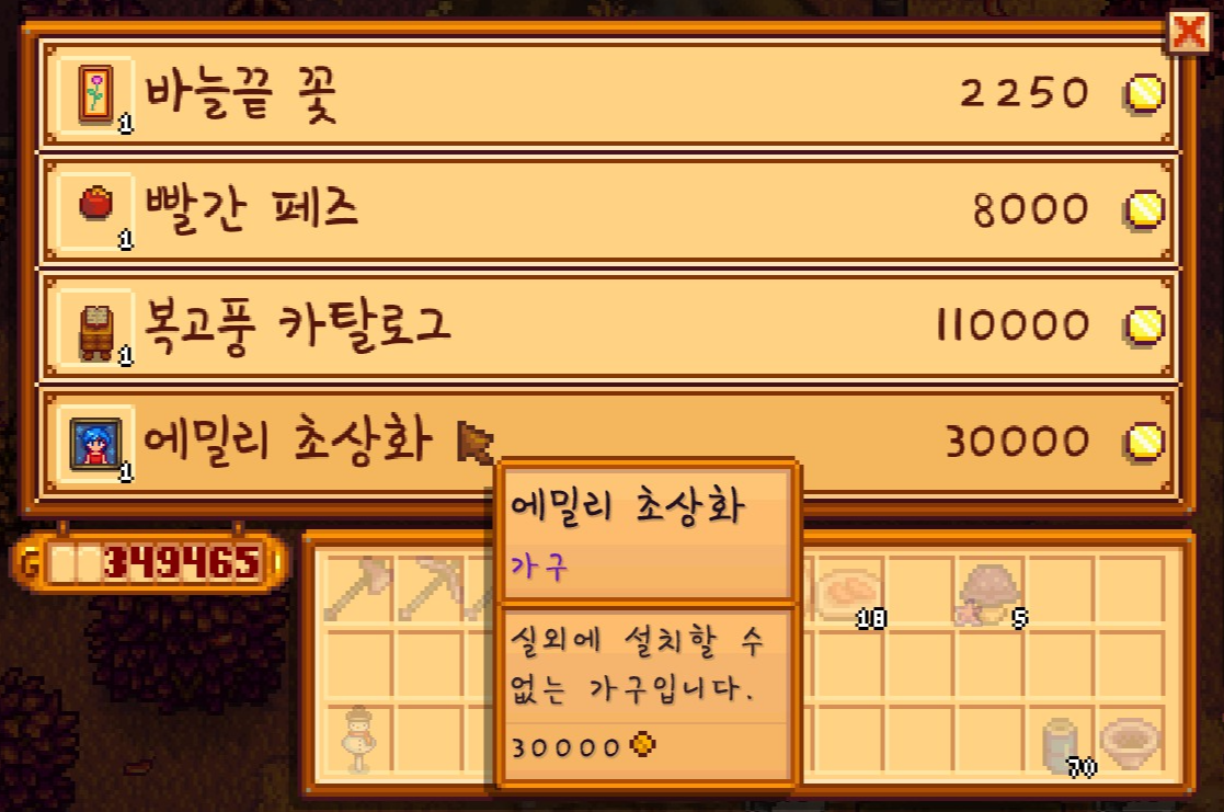 이제 돈이 어느정도 모였기 때문에 돼지마차에서 에밀리 초상화를 구매했습니다. 저번에도 몇번 봐서 사고는 싶었는데 드디어 구매할 수 있게 됐네요.