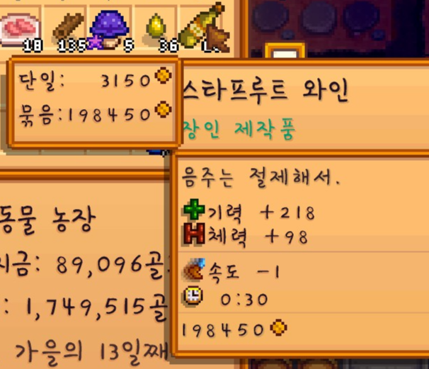 전부 다 모으니 가격이 무려 20만 골드나 합니다! 역시 스타후르츠가 최고네요.