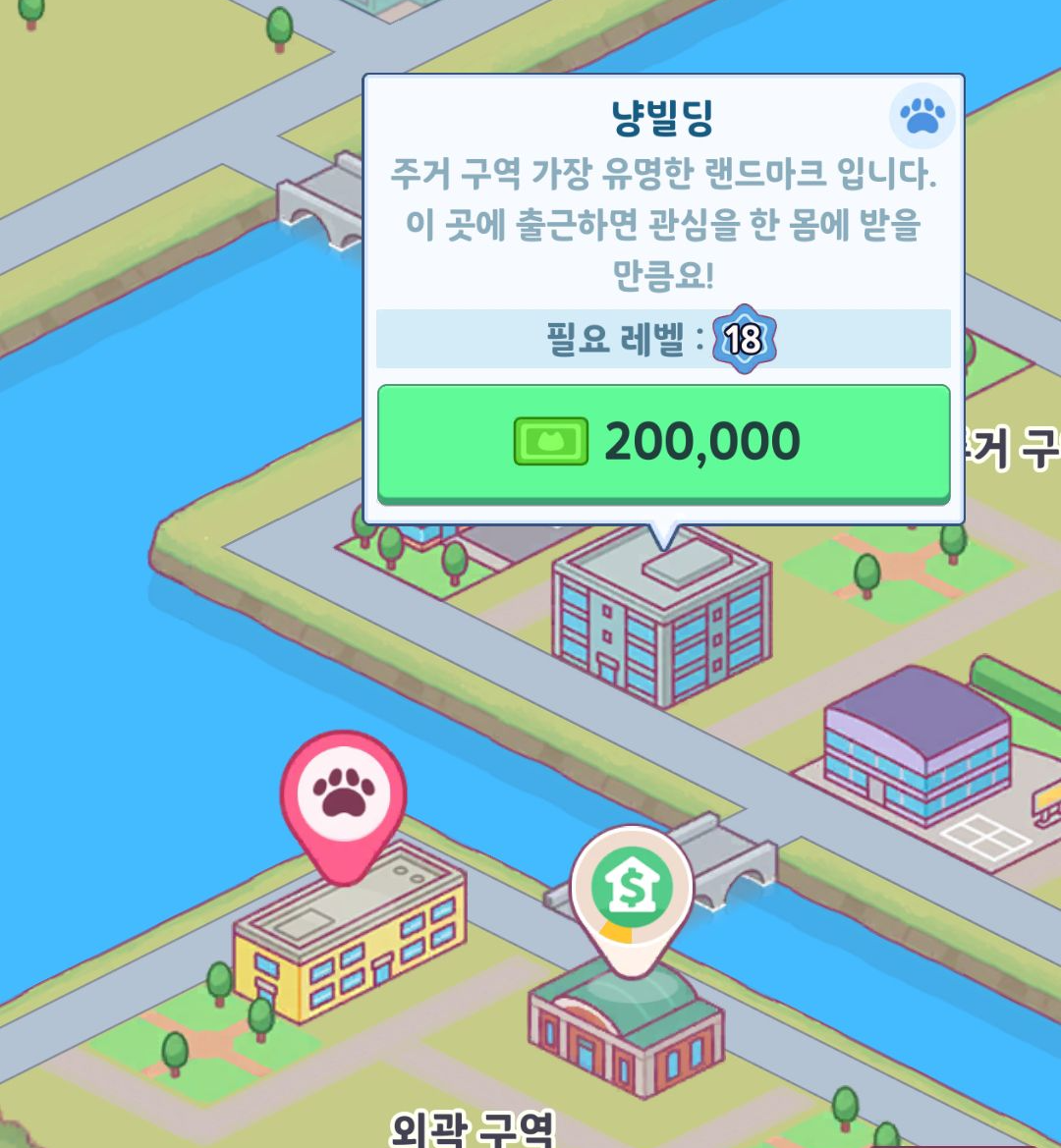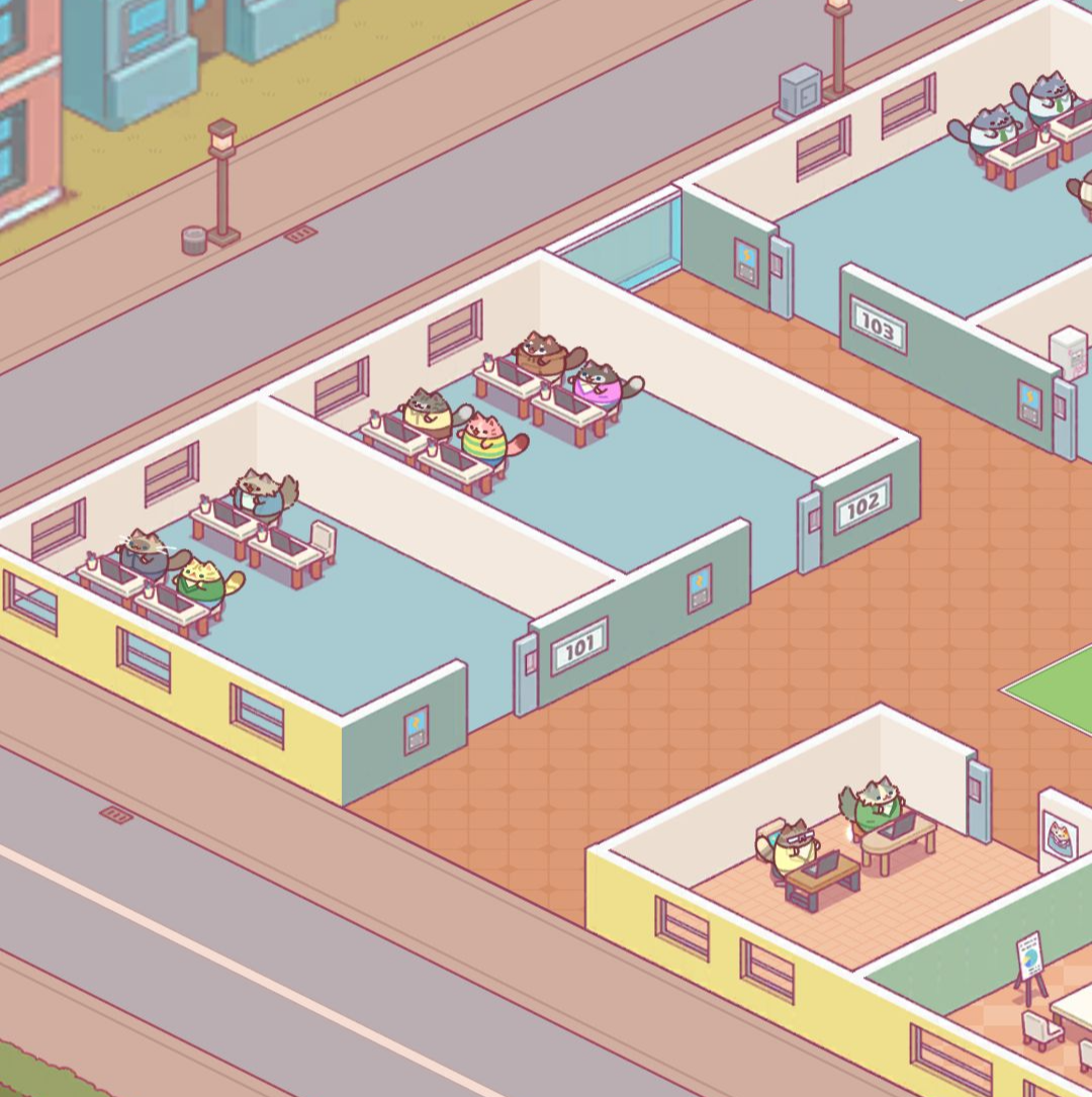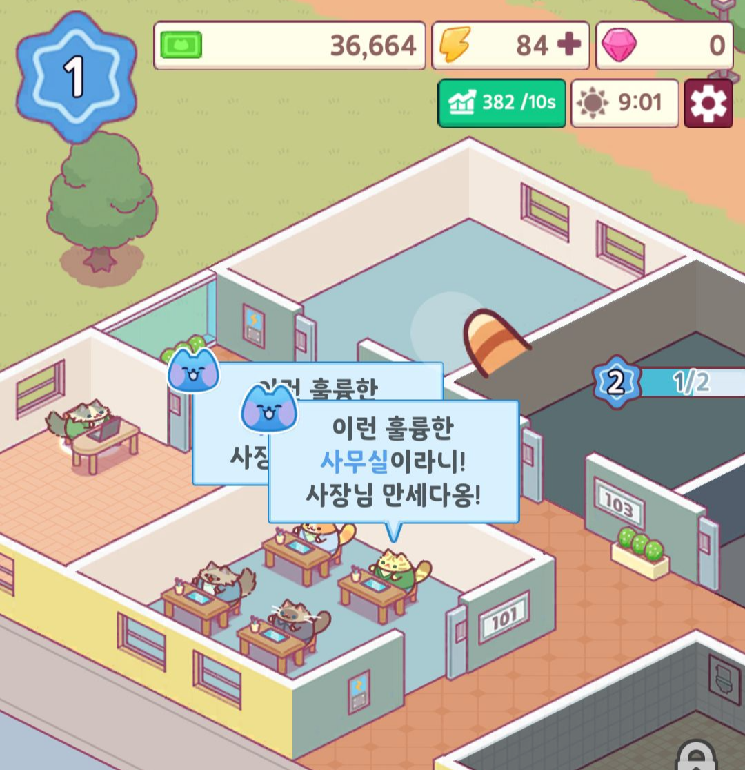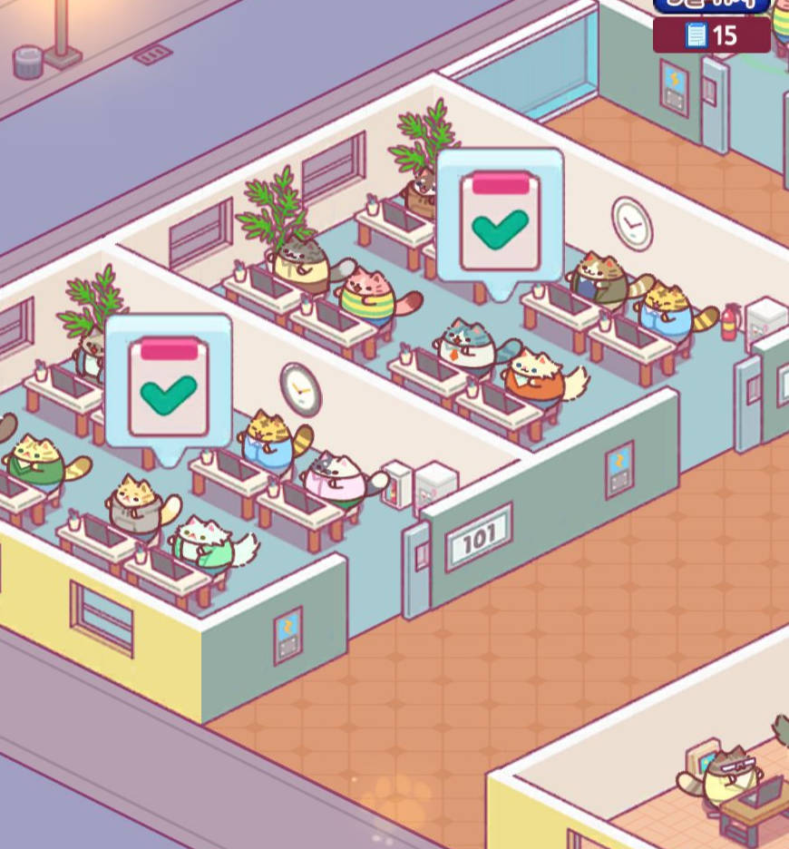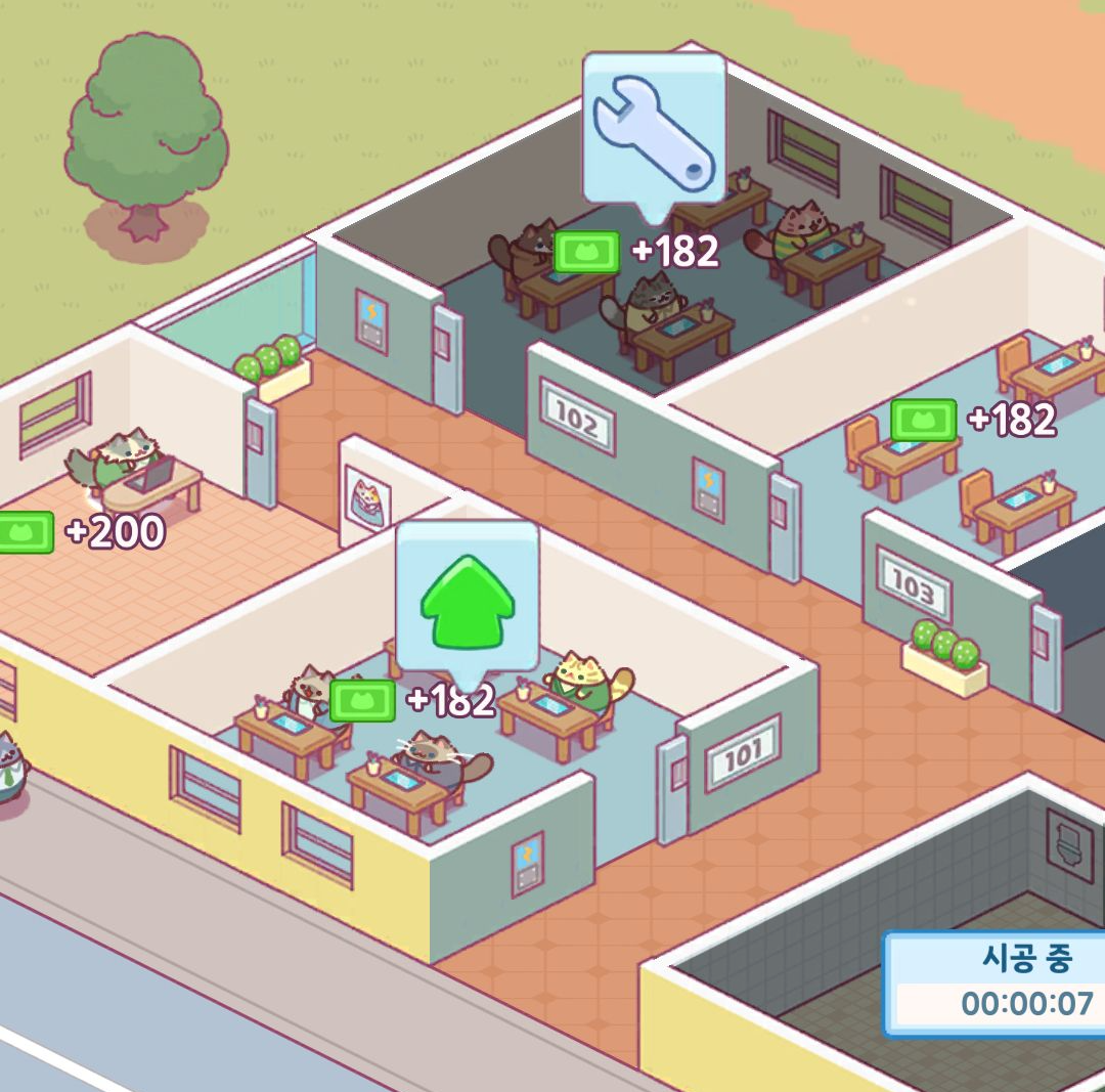 건물주가 되어 각종 고양이들이 사무실을 운영해 돈을 버는 방치형 타이쿤 게임입니다.