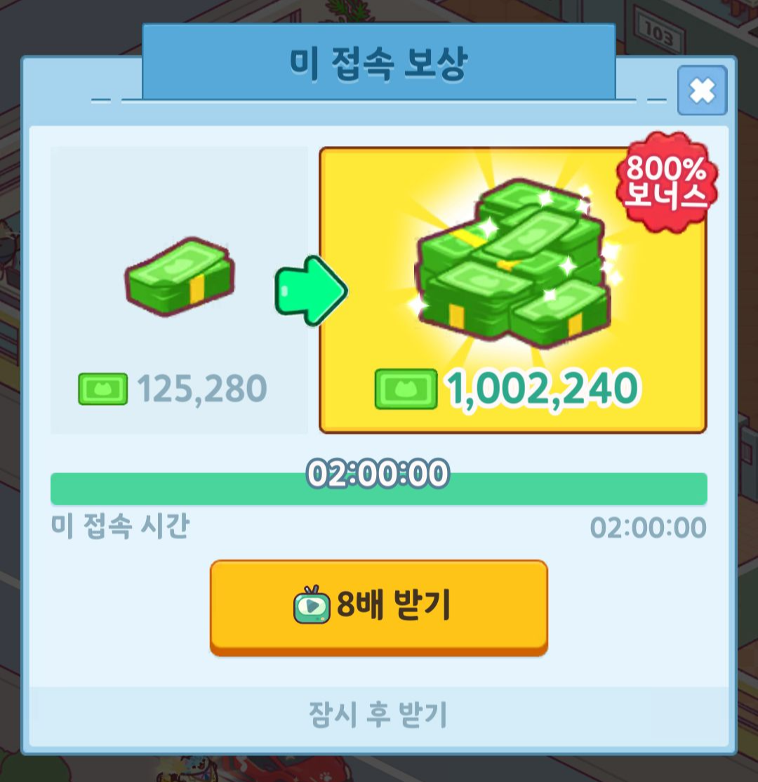 방치형 게임 답게 오프라인 보상도 존재하는데요. 최대 2시간인데 동영상 광고를 통해서 8배를 받을 수 있다고 합니다. 보통은 오프라인 시간이 긴 방식이 많은데 약간 특이한 방식이네요.