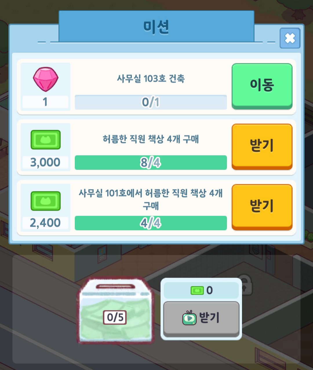 이런 타이쿤 류 게임이 다 그렇듯이 미션을 천천히 따라가다보면 어느정도 빠르게 진행이 됩니다.