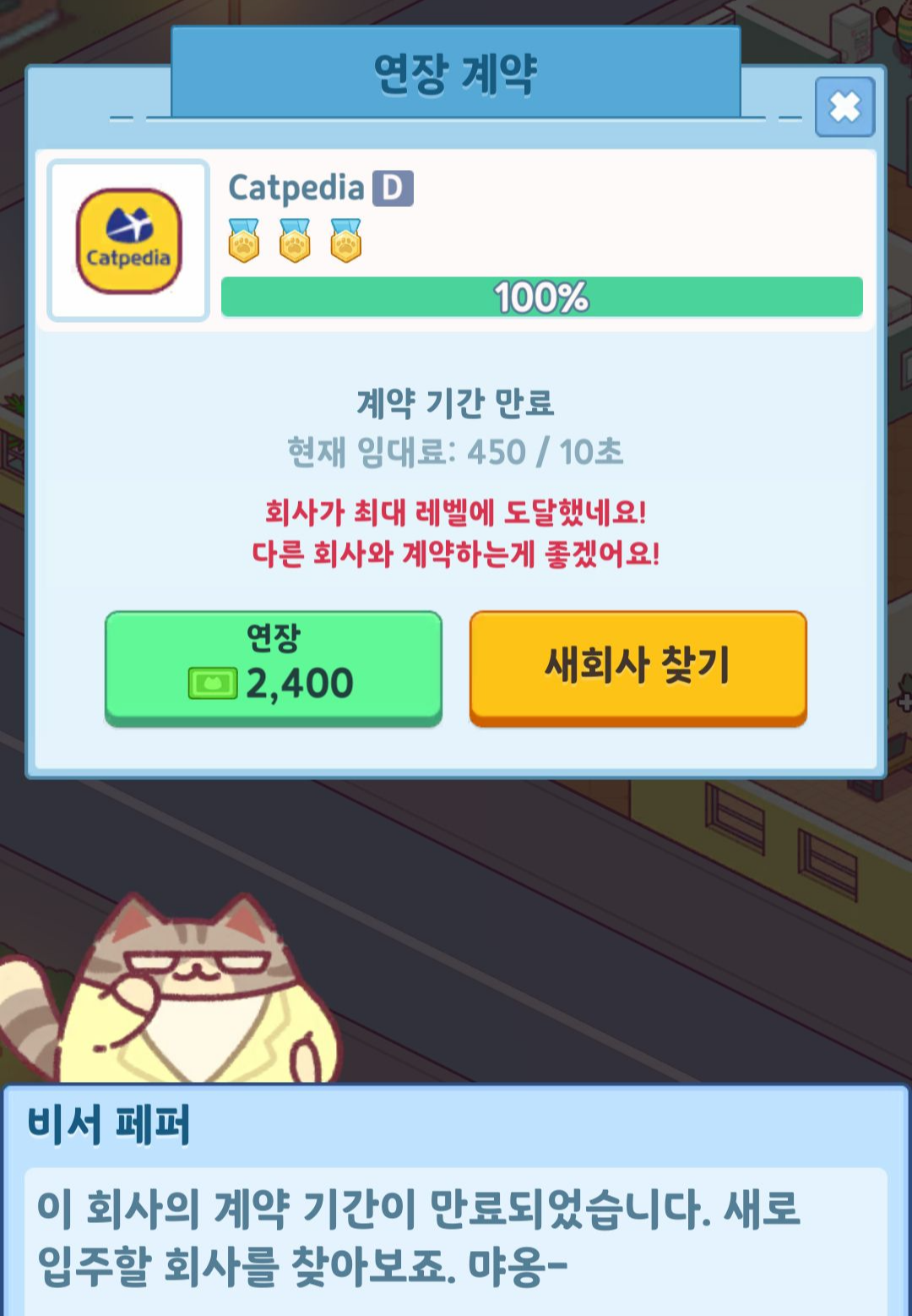 현실 시간이 지나면 해당 회사랑 계약 연장을 할 것인지 새회사를 찾을지 정할 수 있는데요. 상위 컨텐츠를 위해서는 각 회사의 경험치를 다 채워야 하는데요.