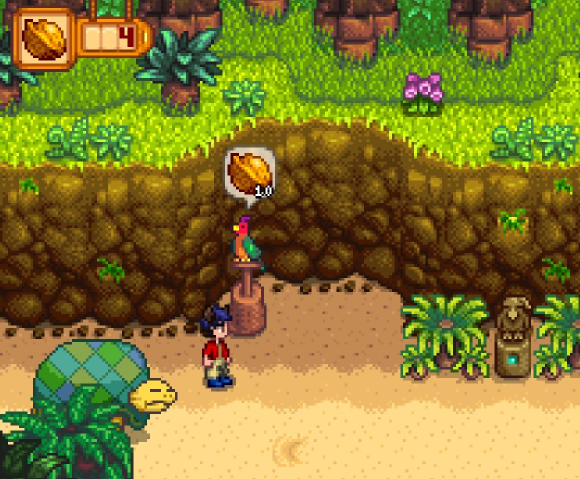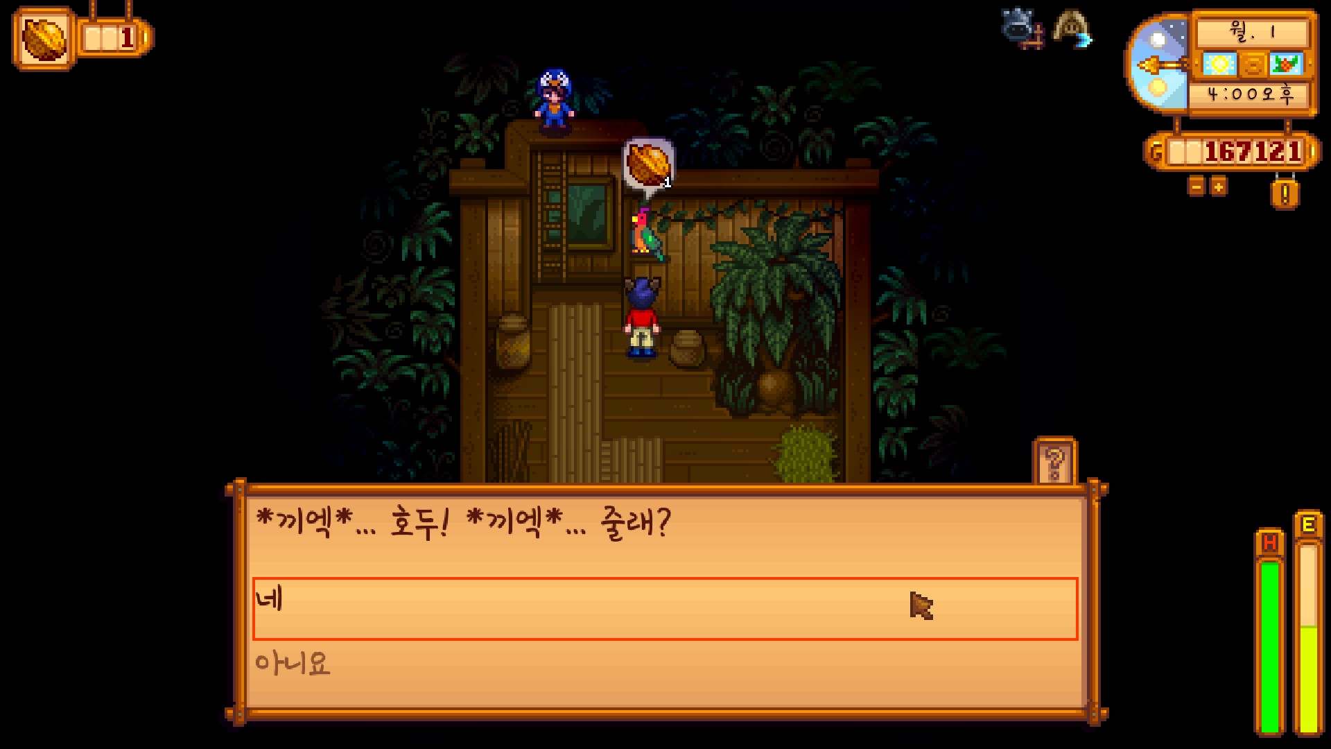 가다 보니 한 NPC를 만나게 되었는데요. 앵무새가 황금호두 하나를 달라고 하는데요.