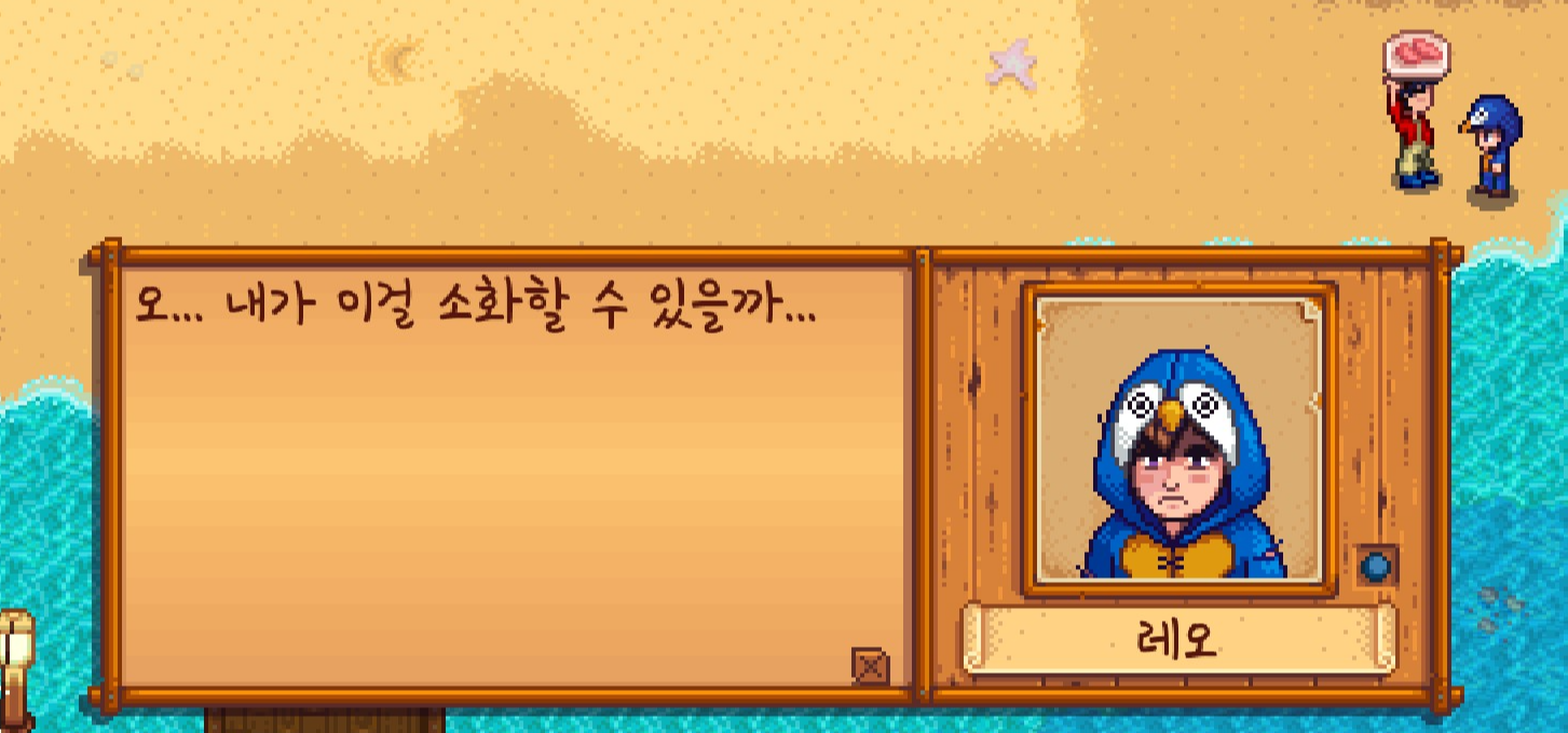 이제 레오도 호감도 관리를 할 수 있게 되었는데요. 섬에 사는 친구라 그런지 회가 질렸는지 그렇게 좋아하지는 않아 보이네요.