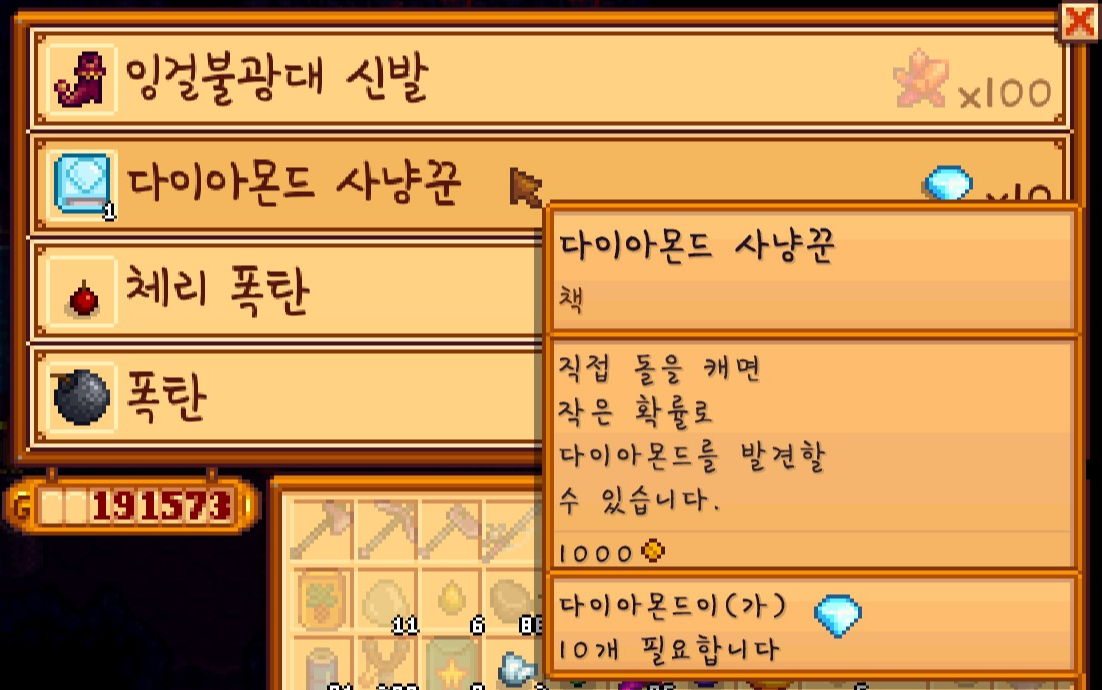 그리고 저번에 화산동굴 5층에 갔을 때 이 책을 구매하지 못해서 내심 아쉬웠는데요. 다이아몬드 10개를 따로 구매 와서 책을 구매했습니다.