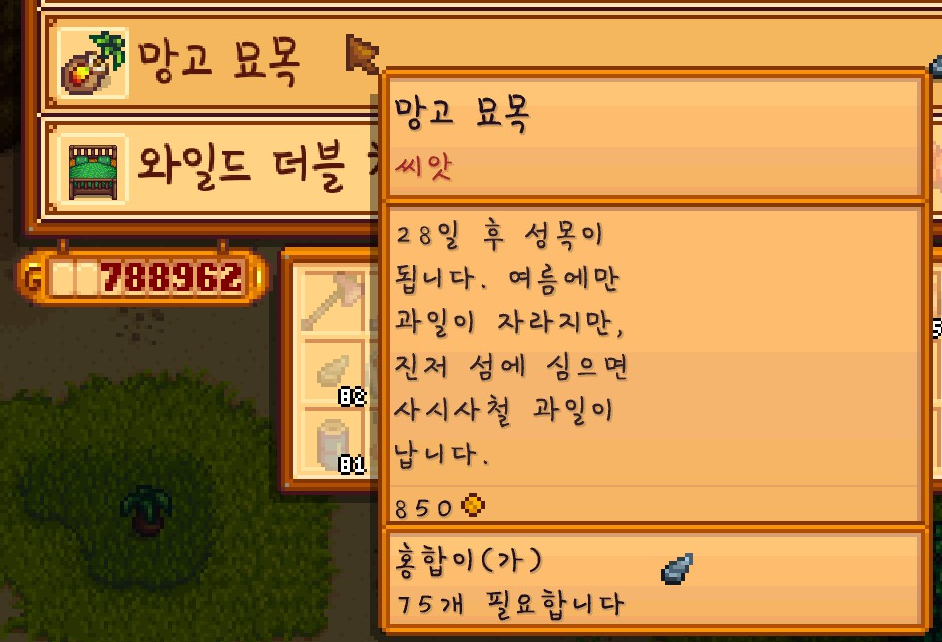 홍합을 꾸준히 모아서 망고 묘목을 하나 더 얻게 되었습니다.