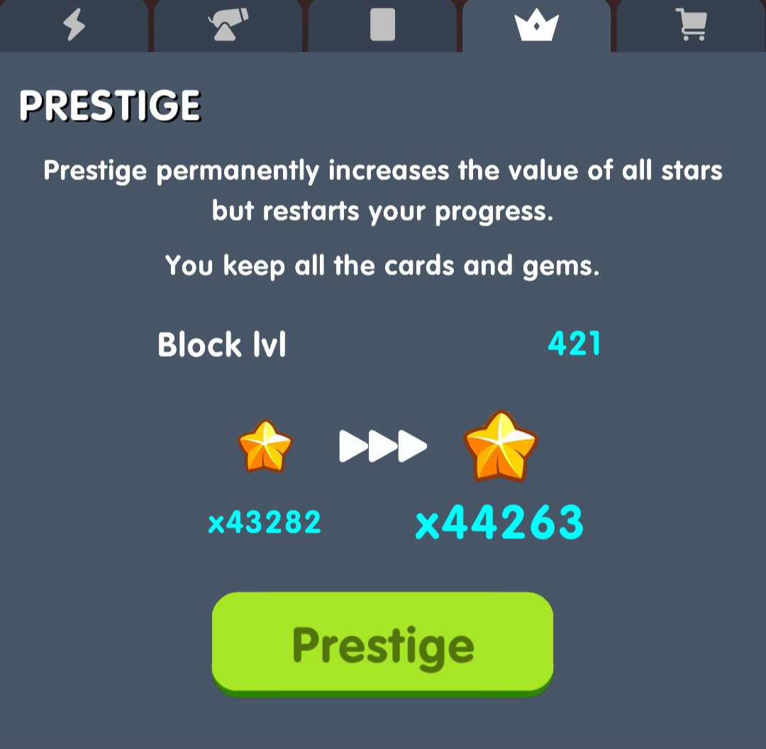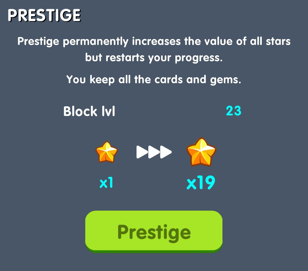 그리고 프레스티지라고 환생 시스템이 존재하는데요. 블럭 레벨이 높은 곳에서 환생을 하면 얻을 수 있는 별의 배수가 높아지게 됩니다.