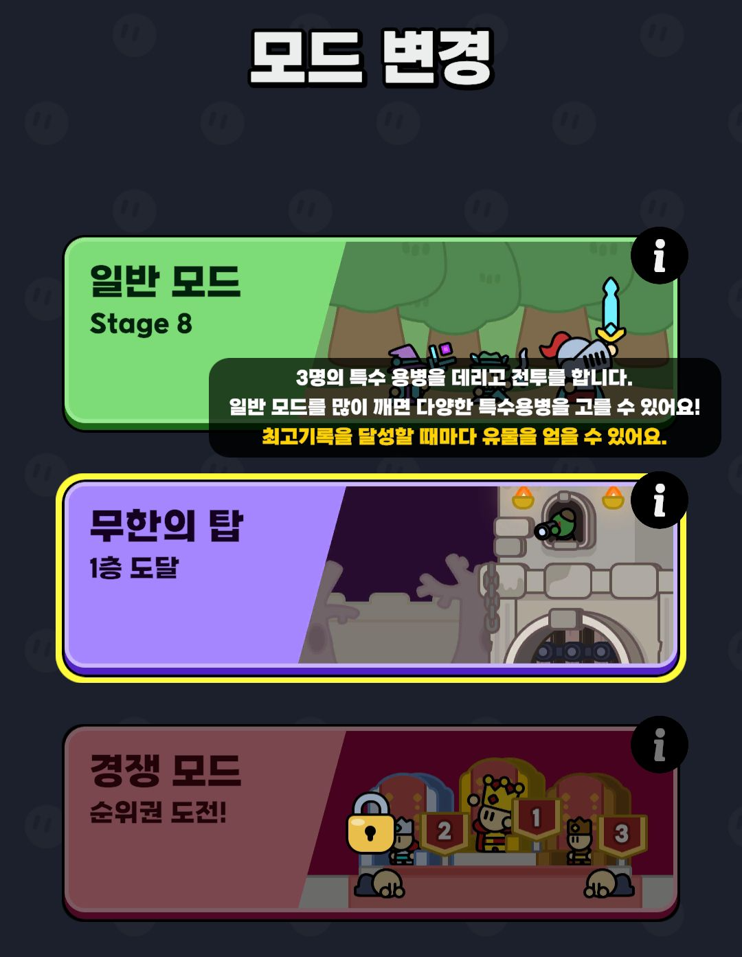 그리고 일반 모드 외에도 '무한의 탑', '경쟁 모드' 등이 있는데요.