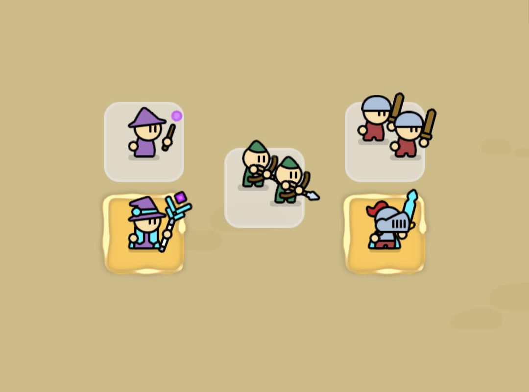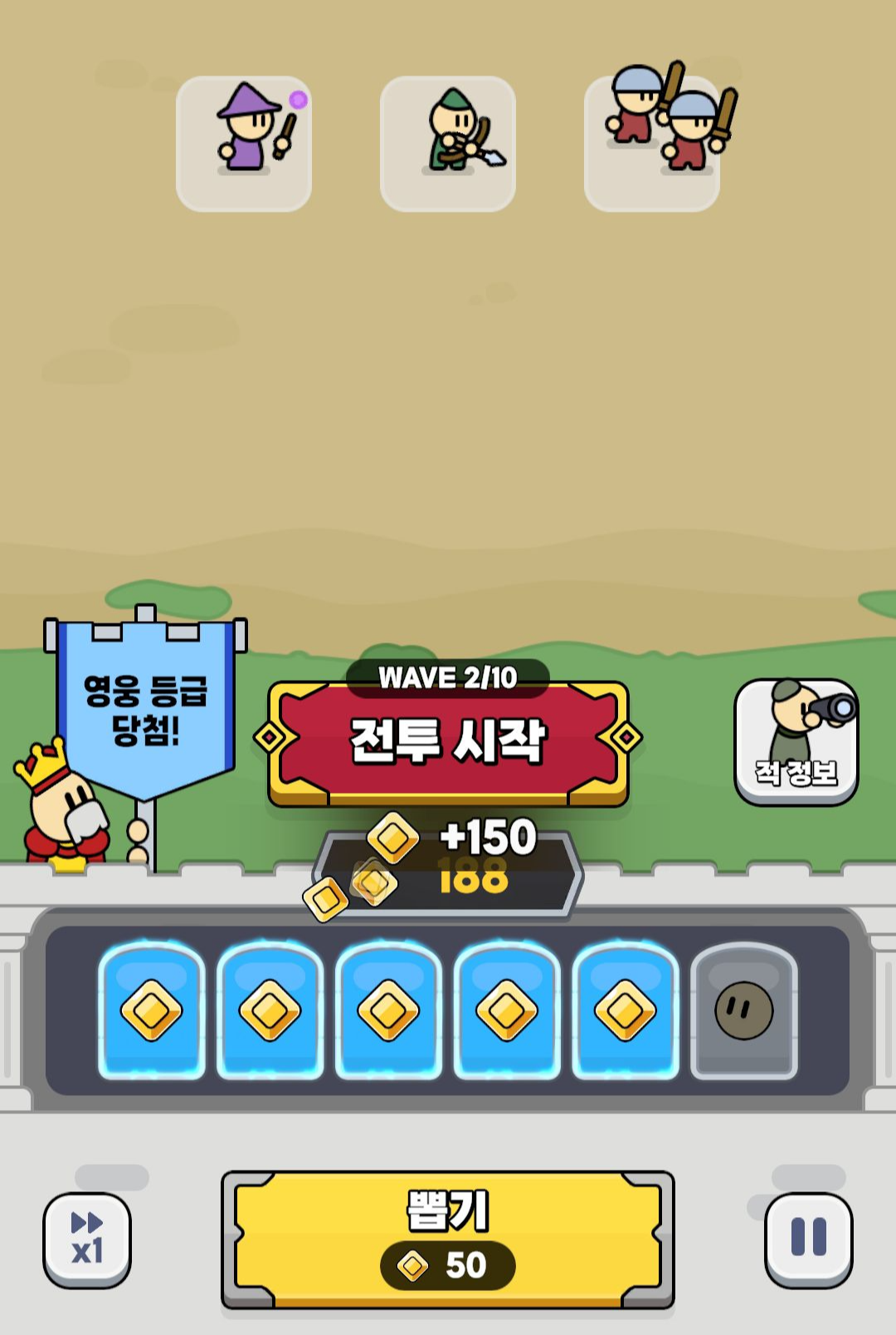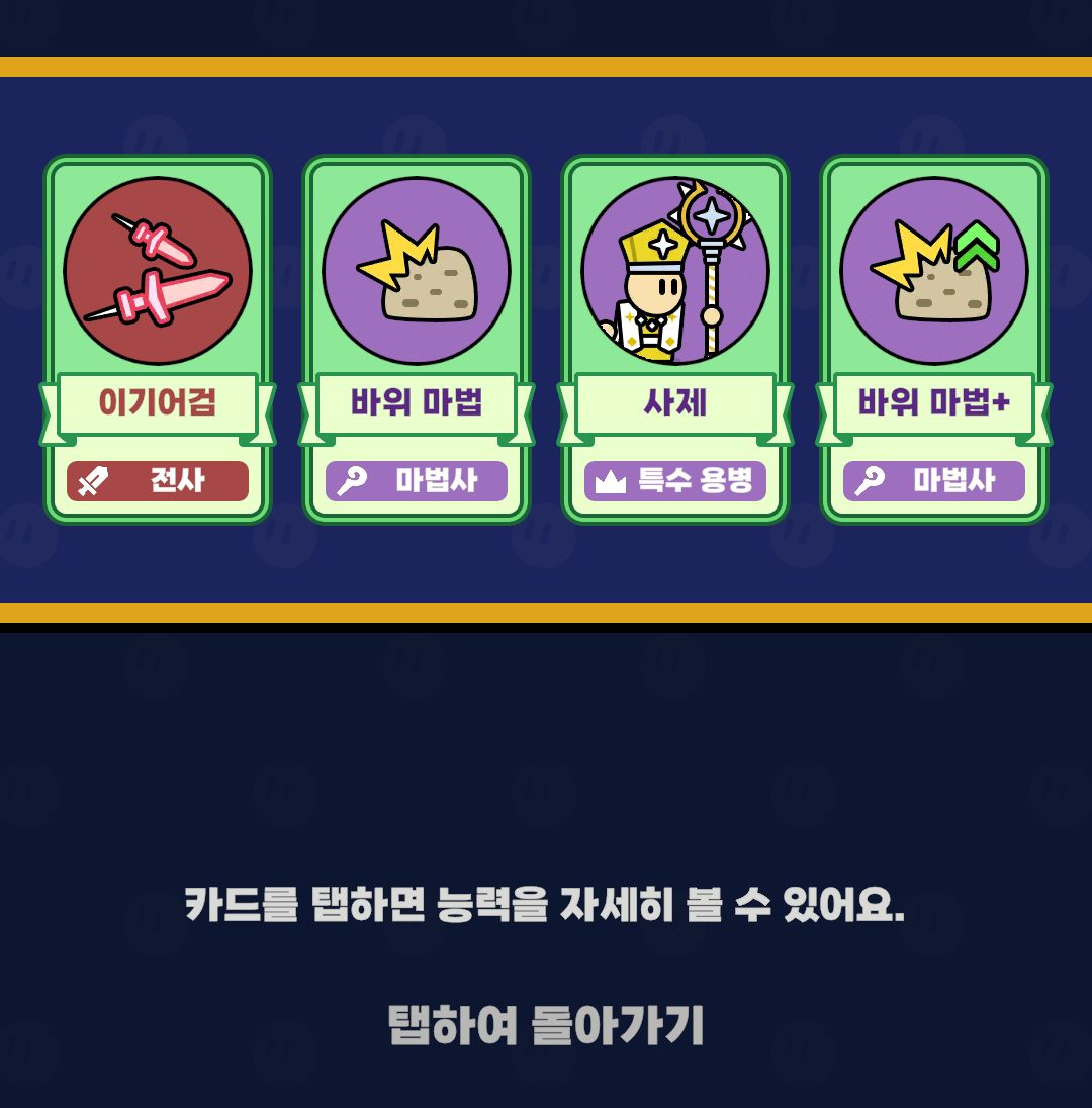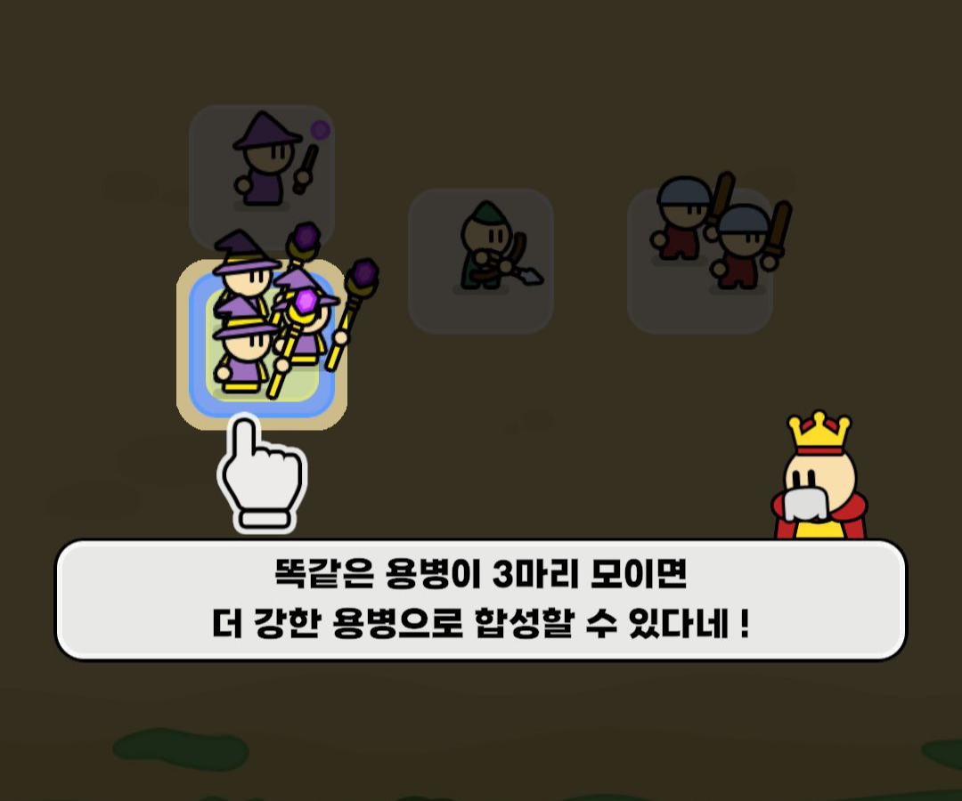 이게 랜덤이라 전사 친구를 합성하면 무조건 전사가 나오는 것이 아니라 전사/궁수/마법사 33% 확률로 높은 등급 한 명이 나오는 방식입니다.