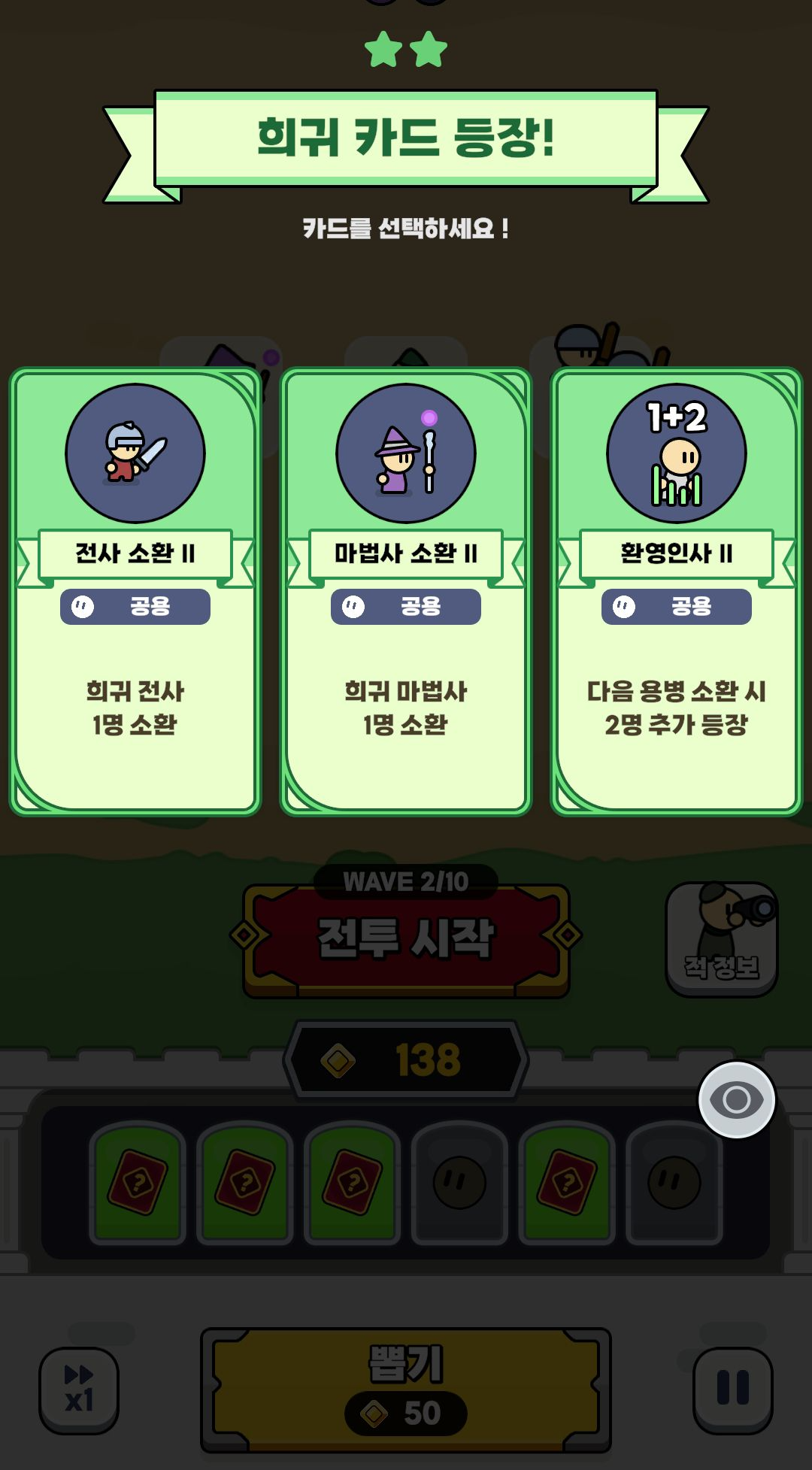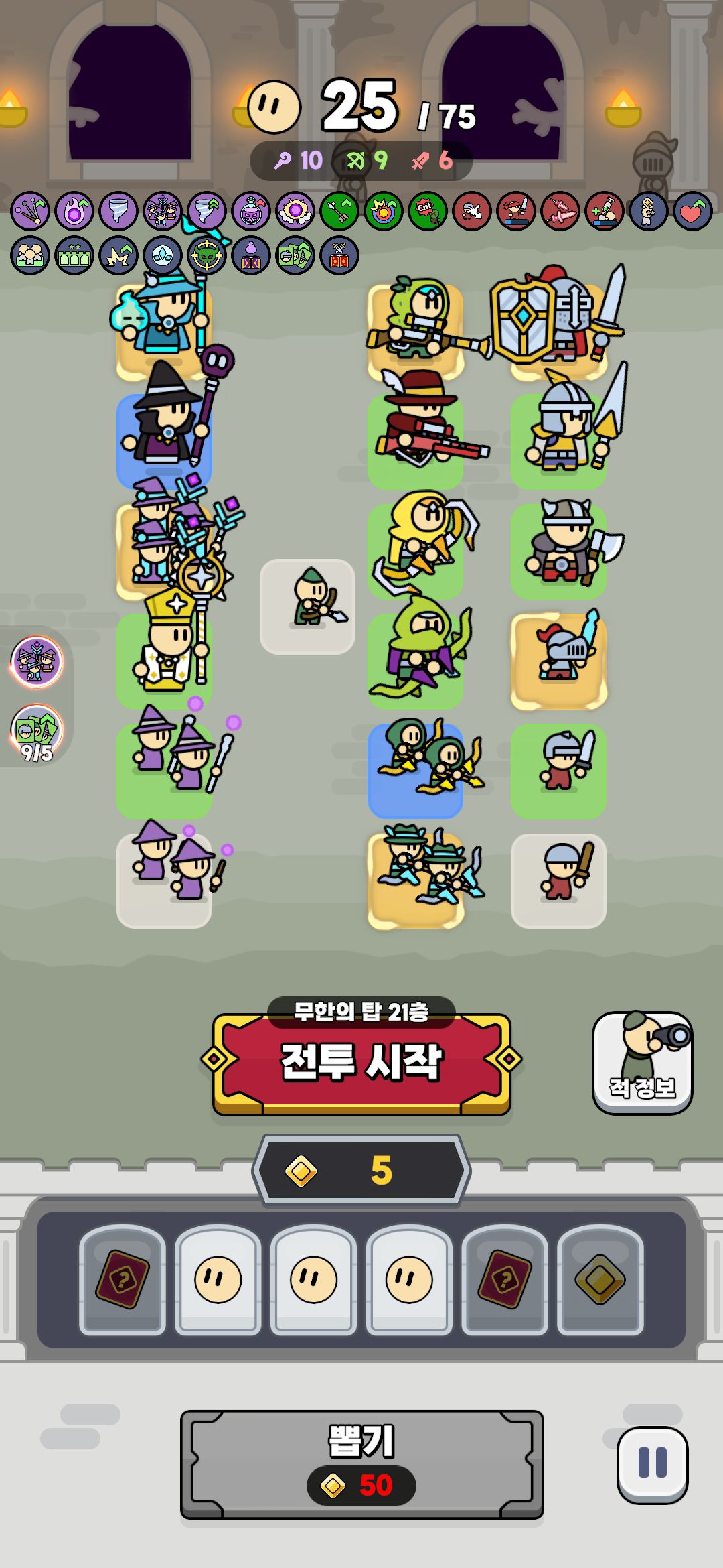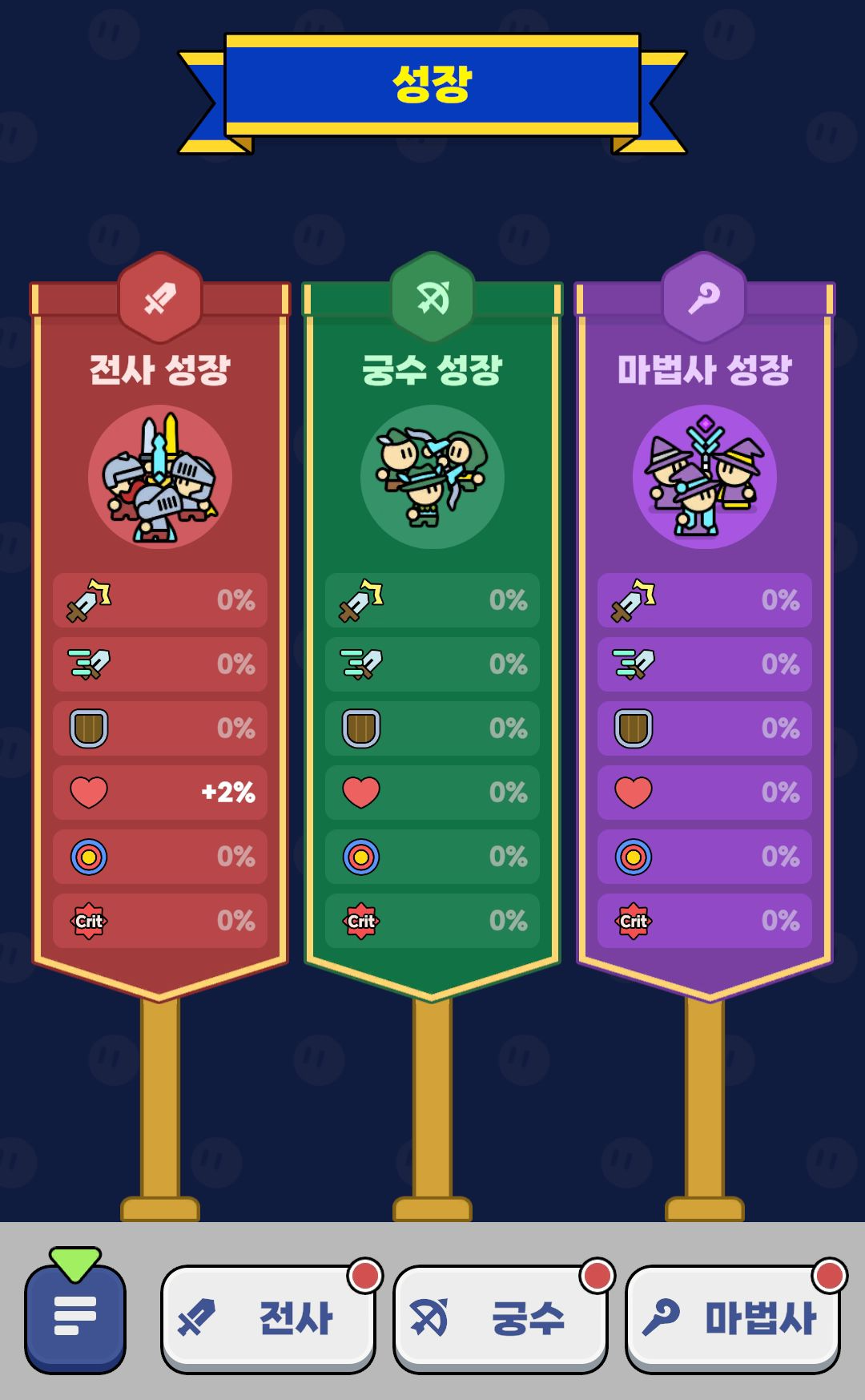 이게 랜덤이라 전사 친구를 합성하면 무조건 전사가 나오는 것이 아니라 전사/궁수/마법사 33% 확률로 높은 등급 한 명이 나오는 방식입니다.