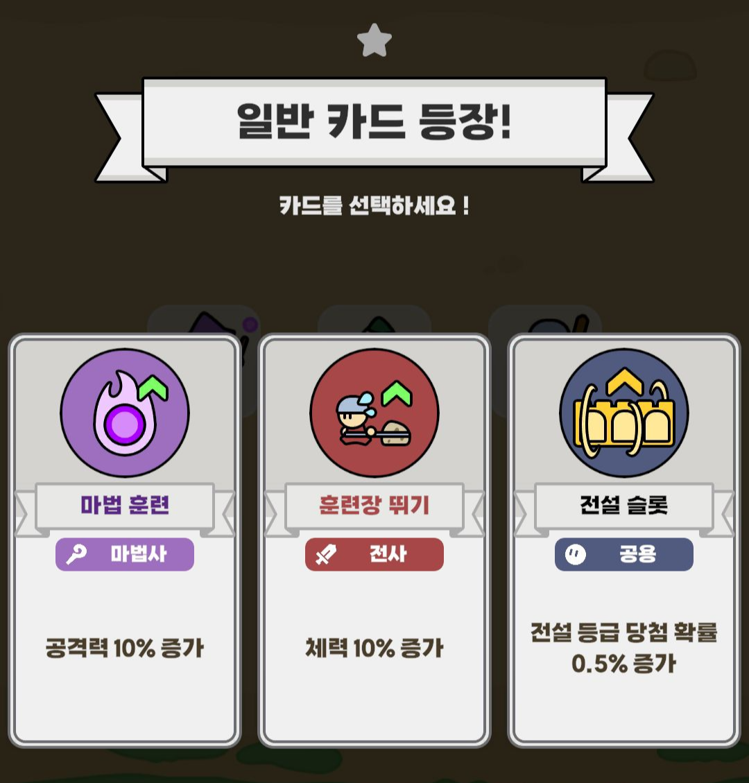 룰렛을 돌리면 똑같은 그림에 따라서 일반>희귀>영웅>전설 등급으로 나오게 되고, 각 등급에 맞는 세가지 선택지 중 하나를 정할 수 있게 됩니다.
