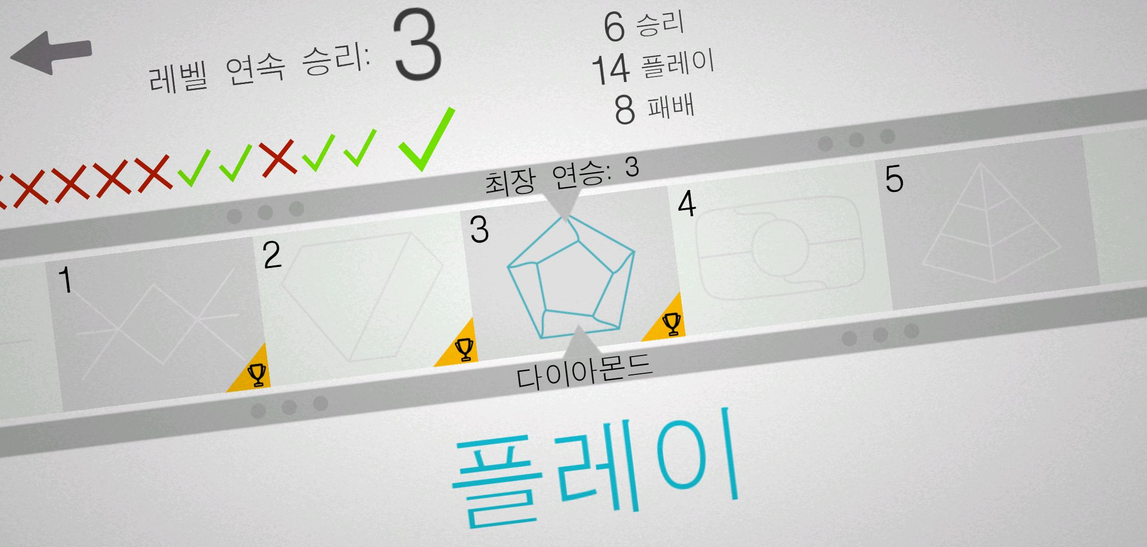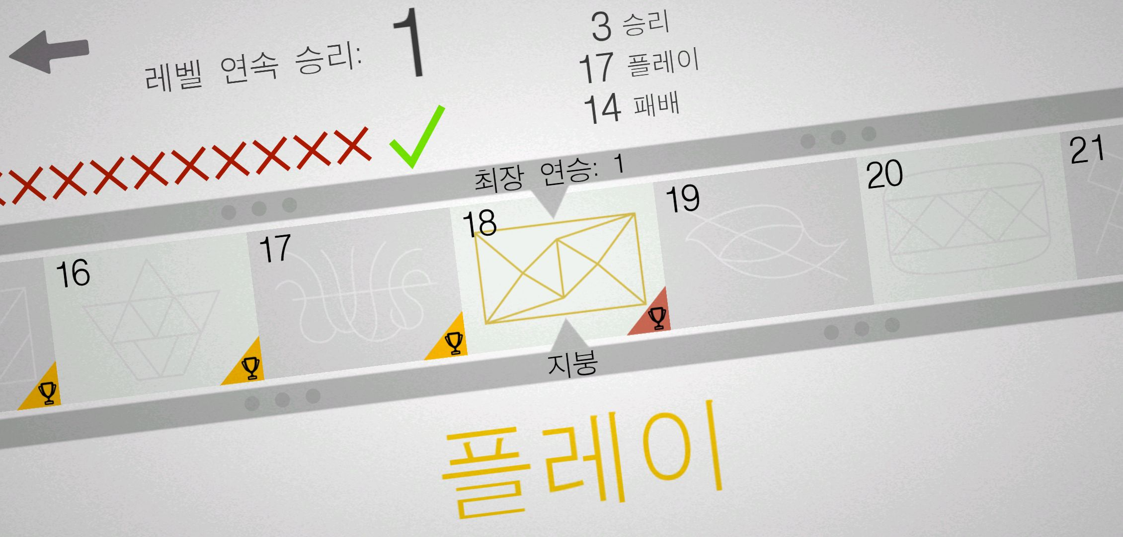 그리고 해당 레벨에서 몇번을 플레이 했고, 승리/패배 수도 확인 할 수 있는데요. 3연승을 해야 골드 트로피를 얻을 수 있다보니 애매하게 2연승에서 끊기는 경우도 꽤나 많았습니다.