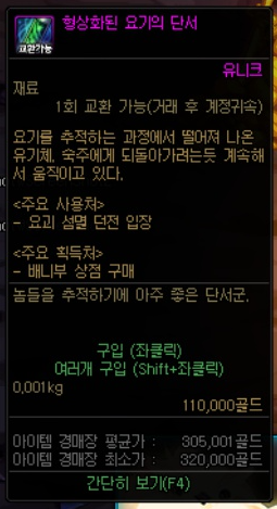 이 친구가 '형상화된 요기의 단서'를 11만 골드에 판매하는 것을 볼 수 있는데요. 무조건 사는 것이 좋습니다. 일단 작성일 기준으로 경매장에서는 30만 골드에 팔리기 때문에 그냥 판매를 해도 큰 이득이 되기 때문이죠.