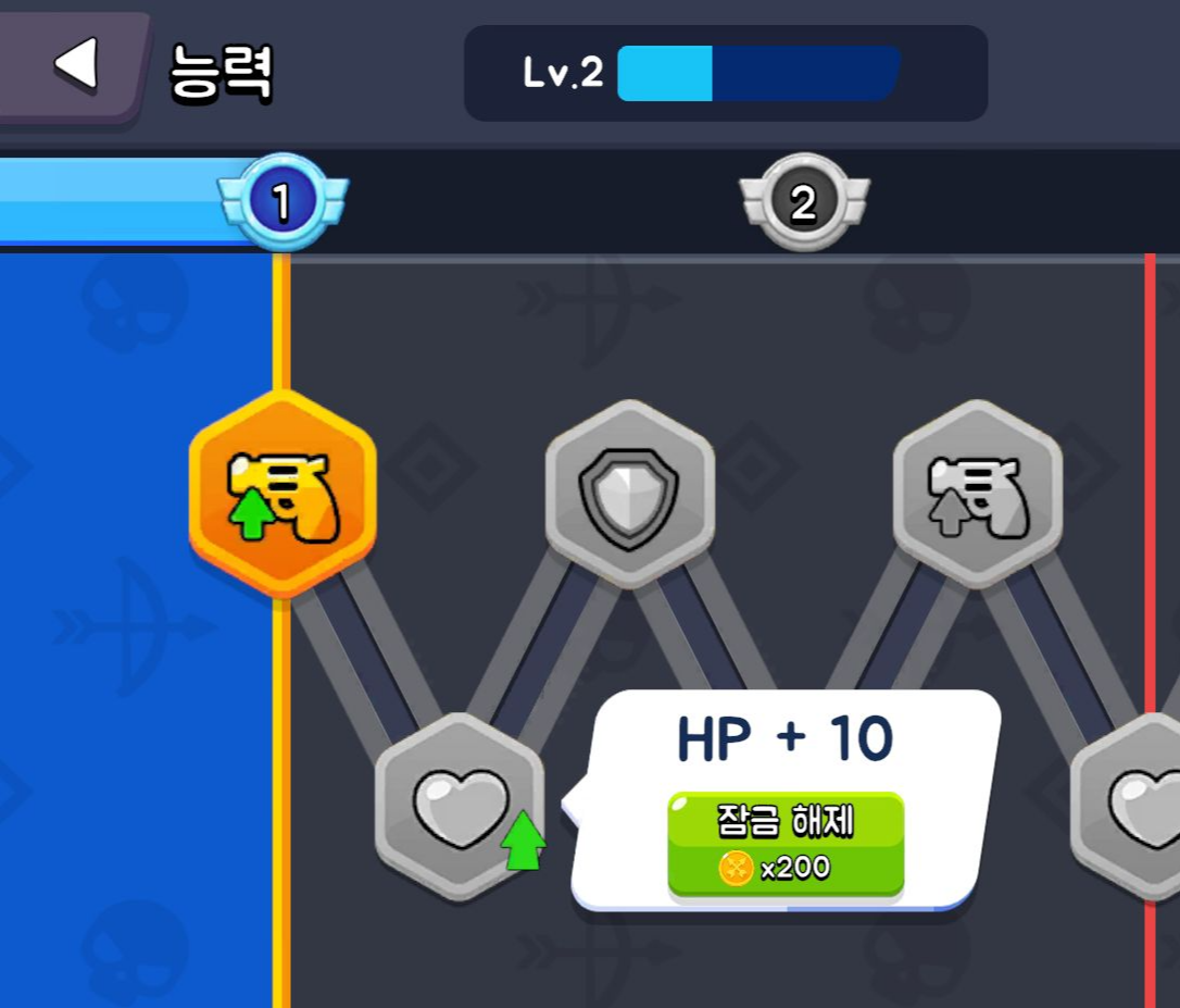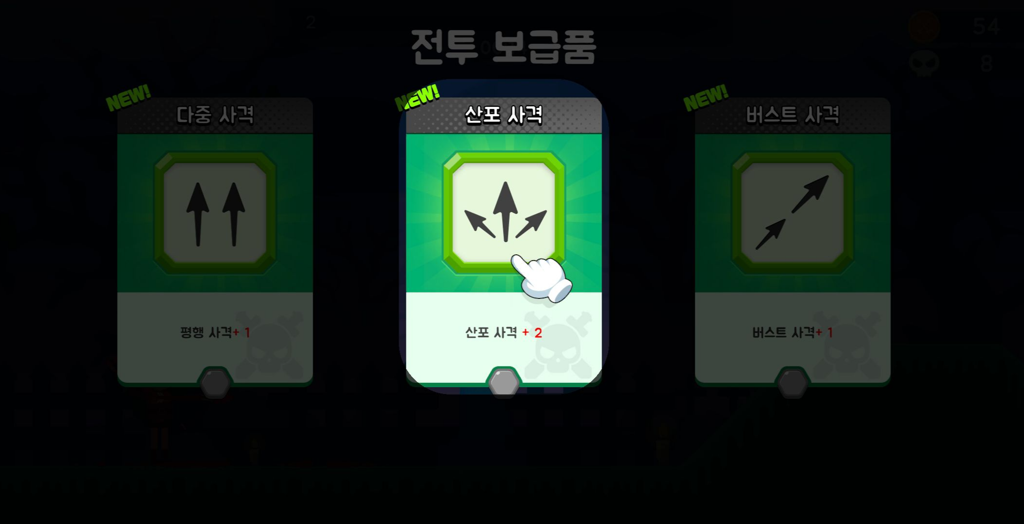 몬스터를 잡으면 경험치가 쌓이는데 레벨이 올라가면 이렇게 삼지선다에서 능력을 하나 고르게 됩니다. 다른 게임에서도 엄청나게 많이 사용되는 방식인데요.
