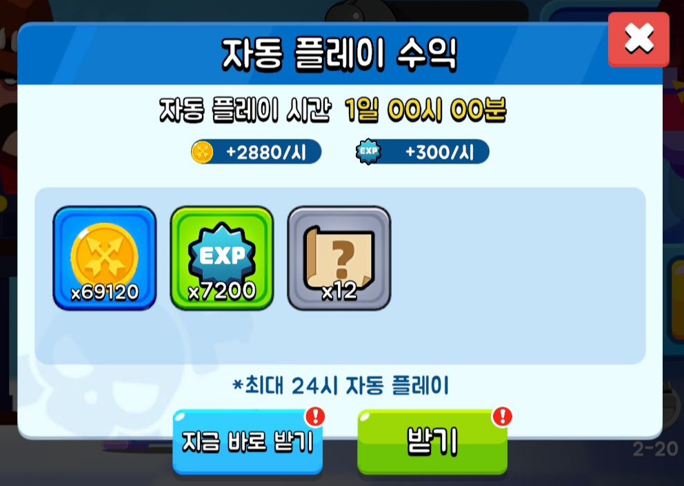 오프라인 방치 수익도 존재합니다. 최대 24시간까지 모을 수 있어서 다른 게임에 비하면 많이 받는 편이라 할 수 있습니다.