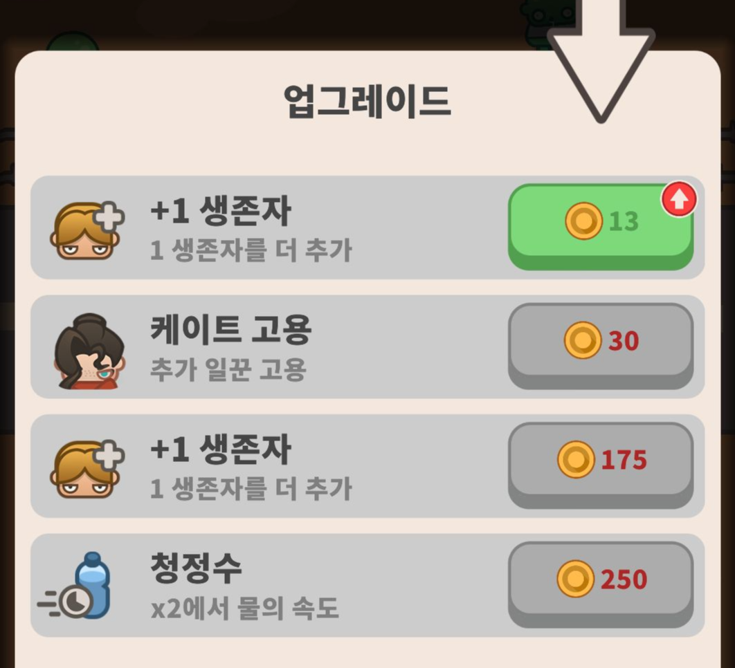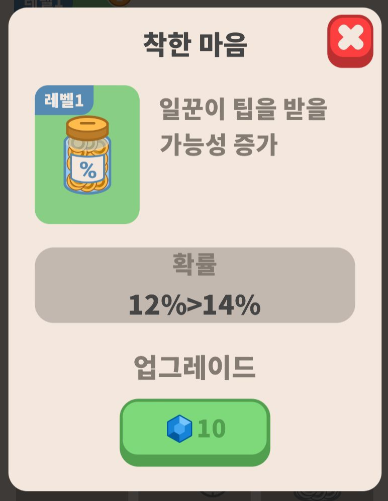 물건들을 판매하면 돈을 얻게 되고, 이걸로 업그레이드를 통해서 가격을 올릴 수도 있고 부가적인 요소도 추가적으로 늘릴 수 있습니다.