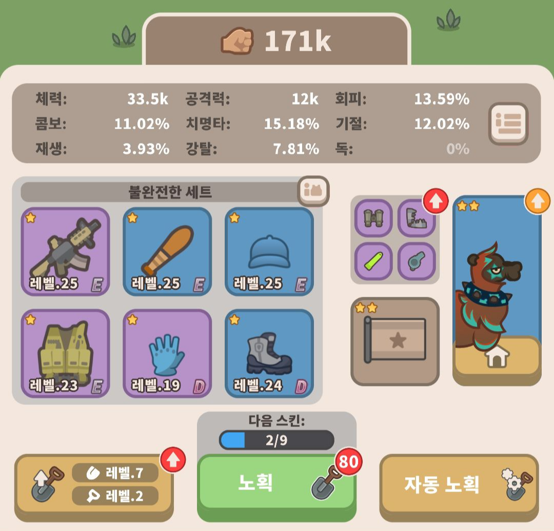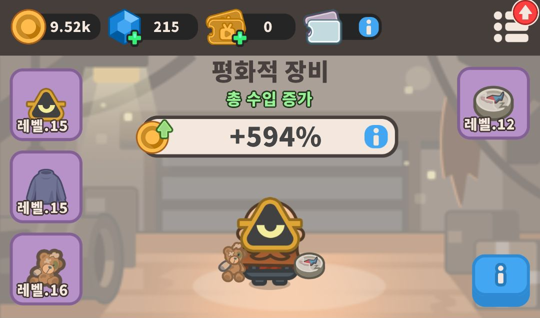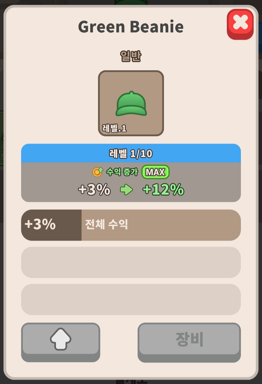 장비는 전체 수익을 올려주는 등의 다양한 버프 등을 달고 있어서 본 게임 쪽에도 영향이 끼치기 때문에 상당히 중요합니다.
