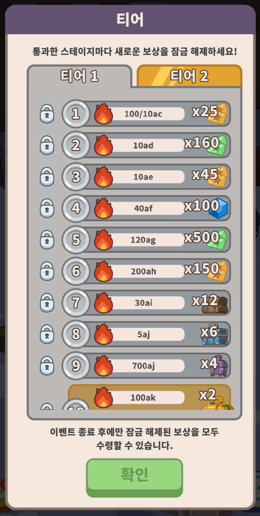 그리고 이런 방치형 게임이 다 그렇듯이. 이벤트 같은 외전 요소가 있습니다. 시간이 2~3일 정도로 제한되고 그동안 최대한 달려서 좋은 순위나 절대적인 숫자를 높이면 더 좋은 보상을 받을 수 있습니다.