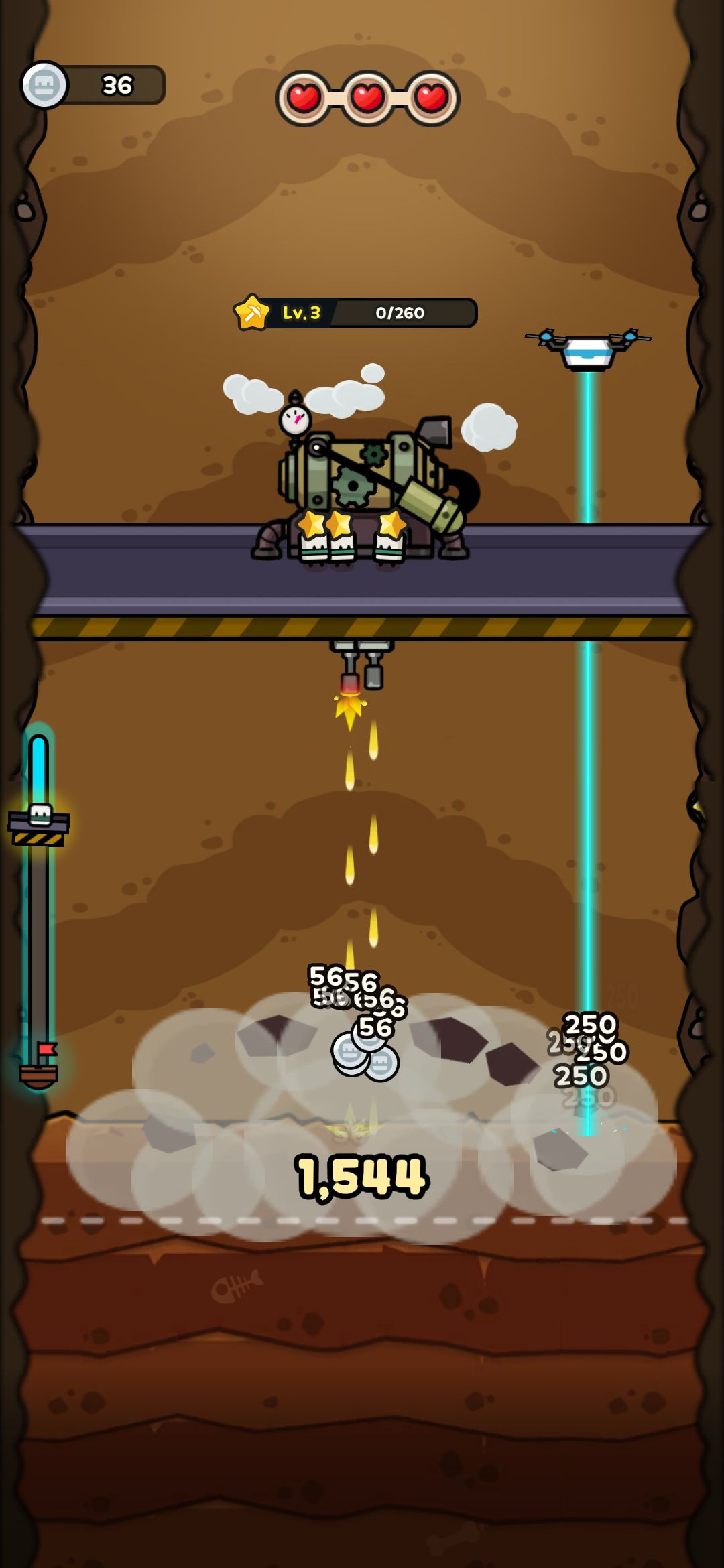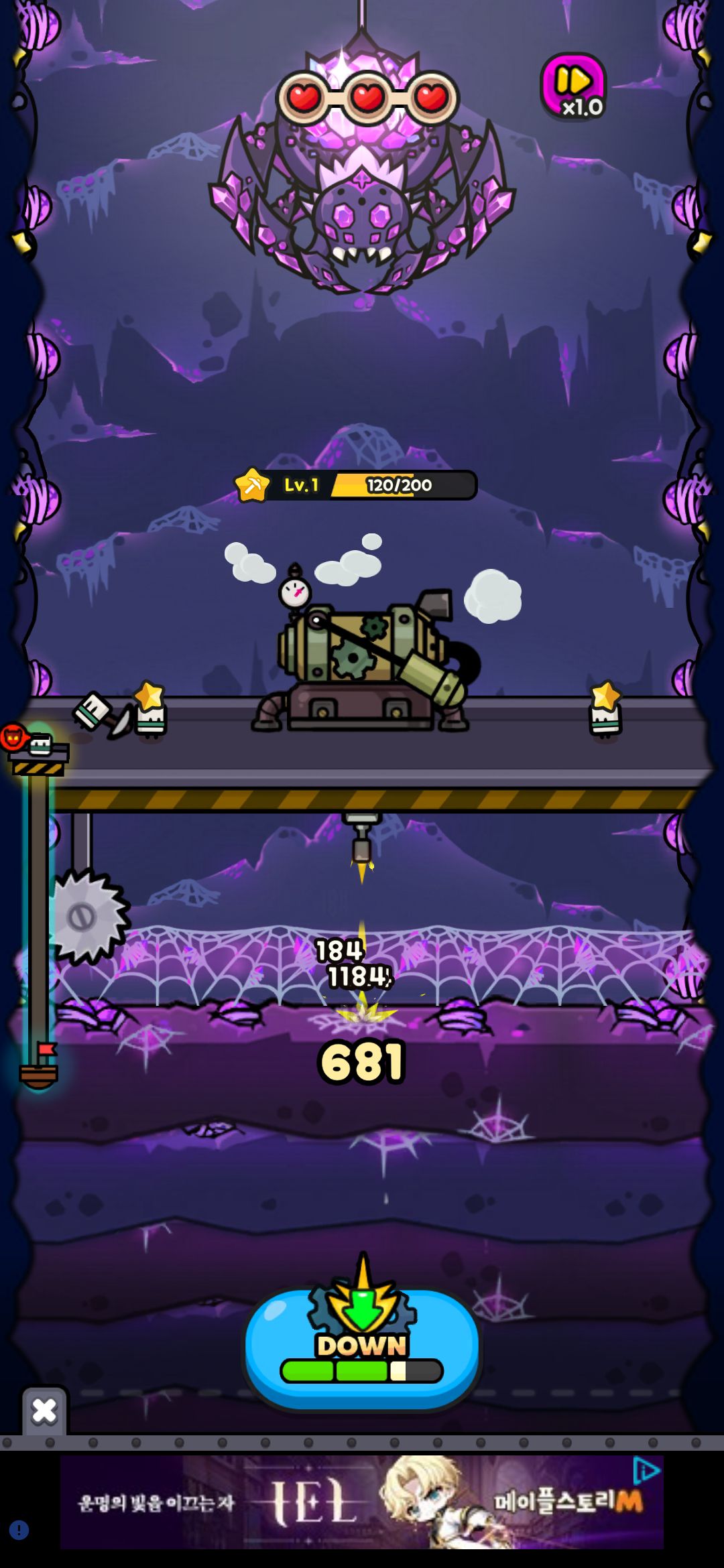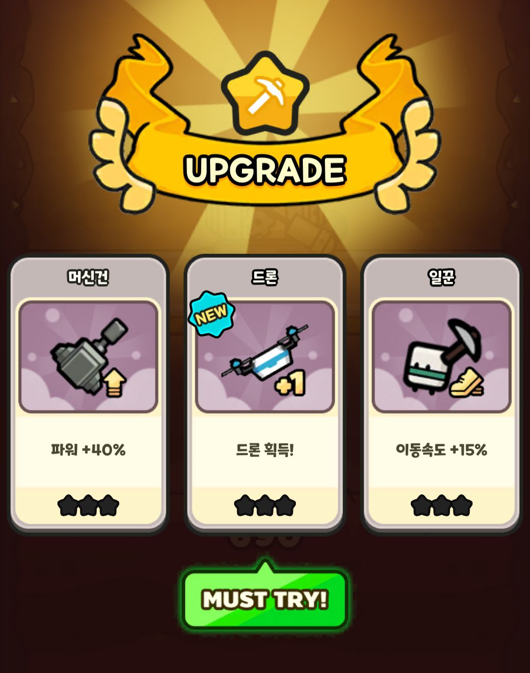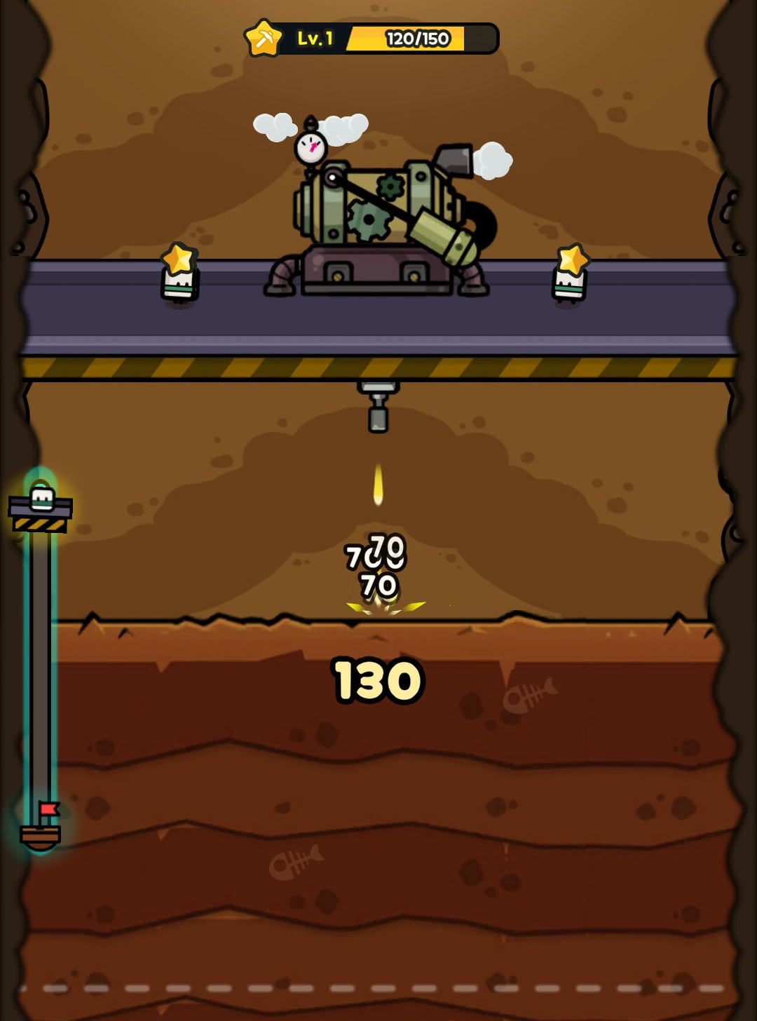 게임이 시작하면 드릴이 무기를 발사하면서 지반을 부수면서 자동으로 내려가게 됩니다. 드릴 위에는 일꾼들이 자원을 캐서 경험치를 모으는데요.