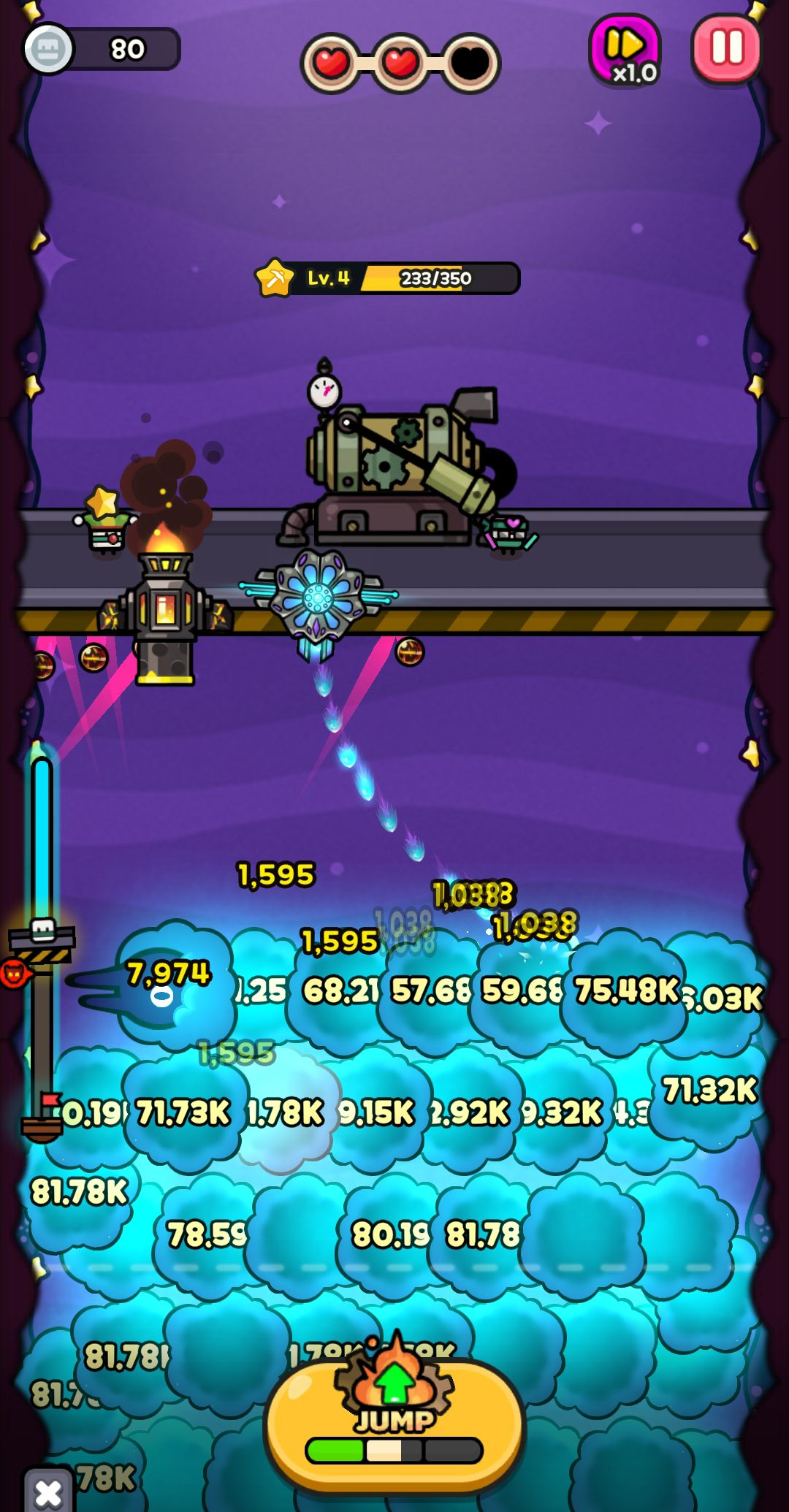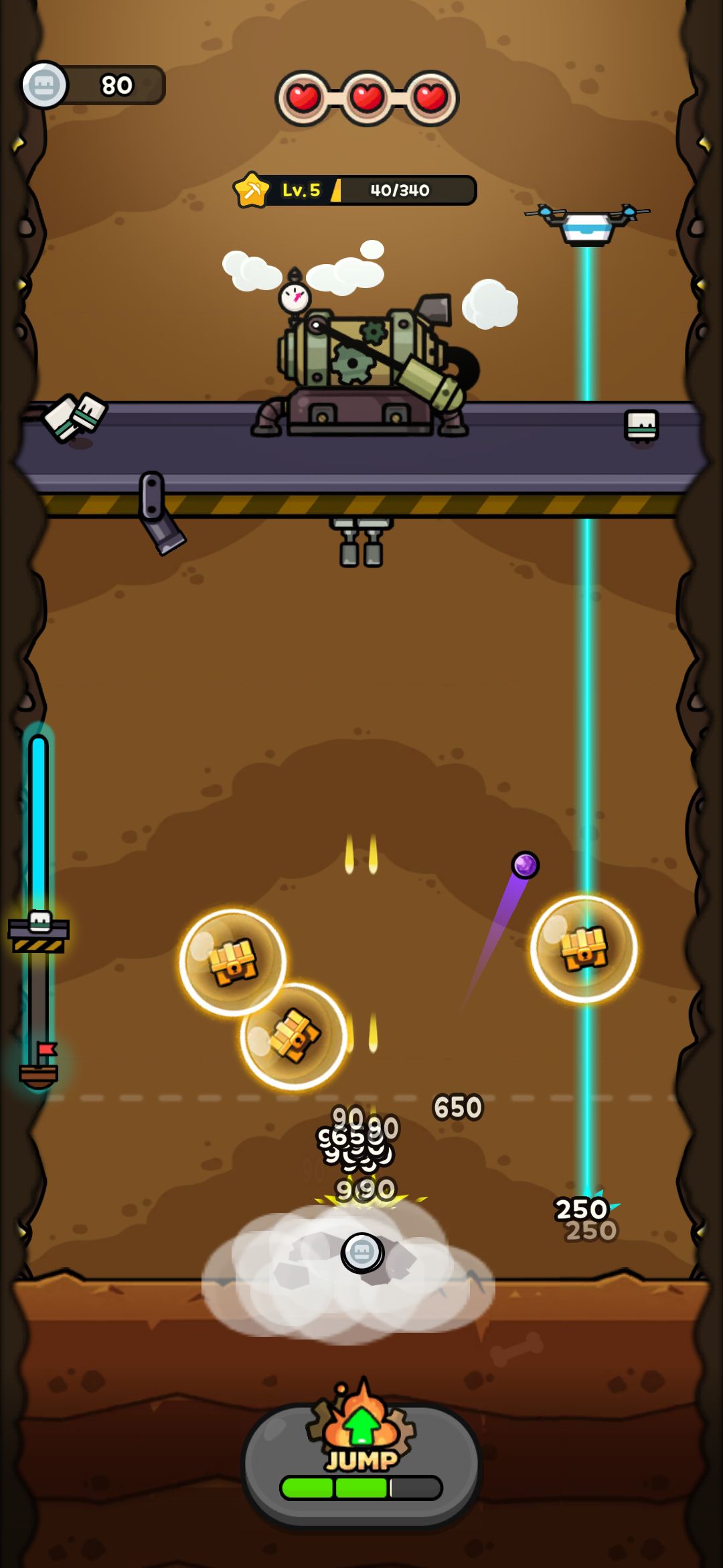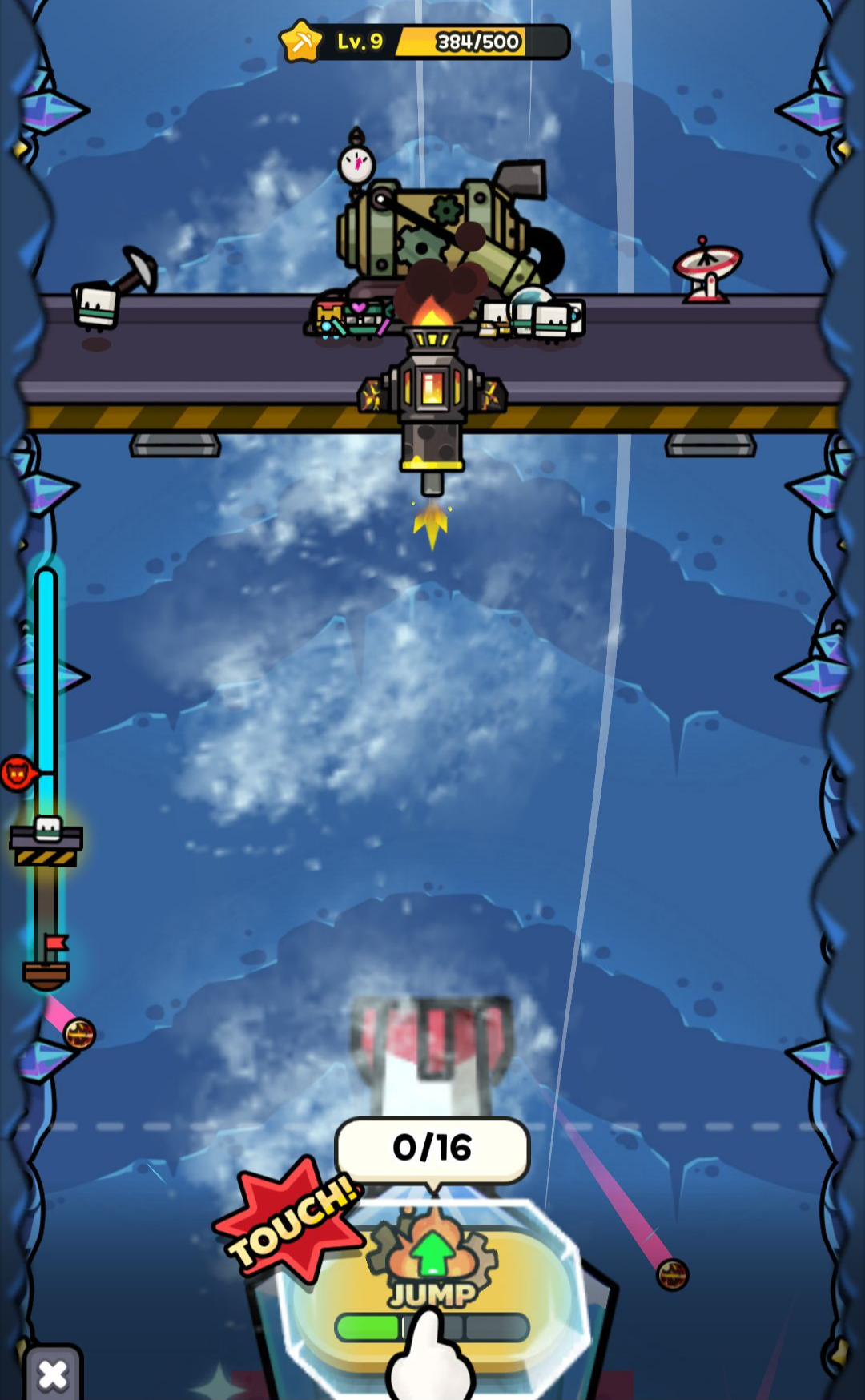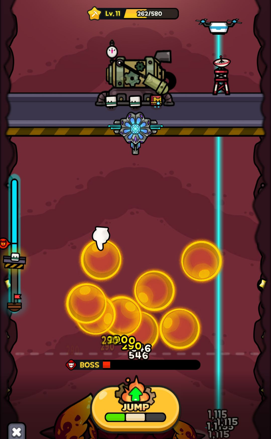 게임이 시작하면 드릴이 무기를 발사하면서 지반을 부수면서 자동으로 내려가게 됩니다. 드릴 위에는 일꾼들이 자원을 캐서 경험치를 모으는데요.