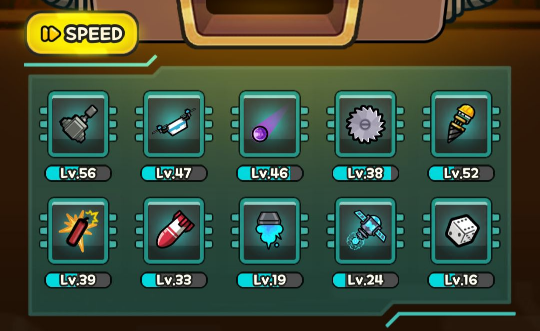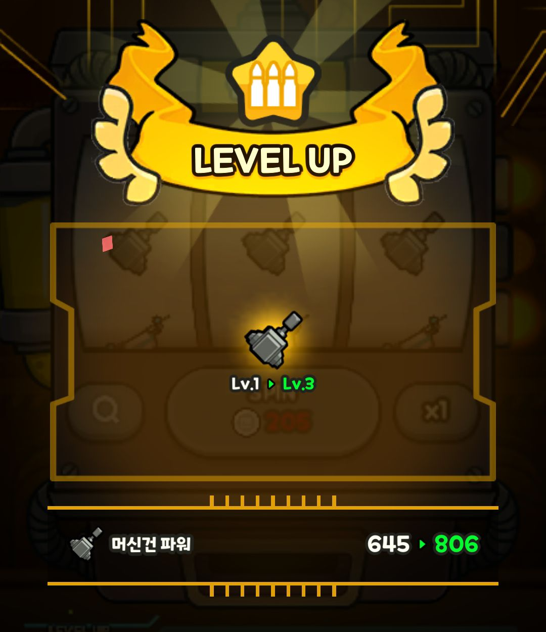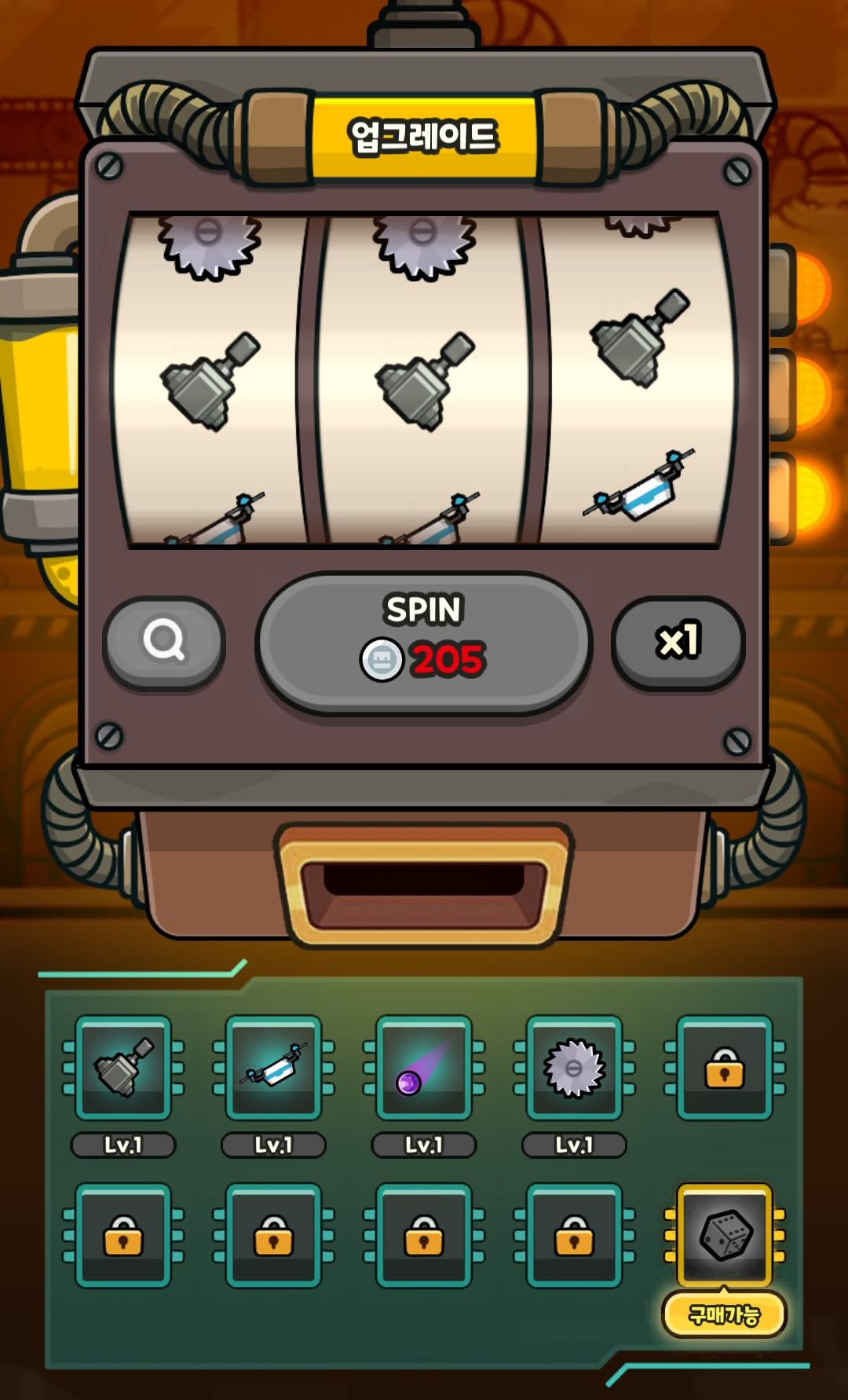 근데 여기서 운의 요소가 하나 있는데요. 무기를 업그레이드를 하기 위해서는 상점에서 사는 그런 방식이 아니라 슬롯머신을 돌려서 레벨을 올리는 방식인데요.