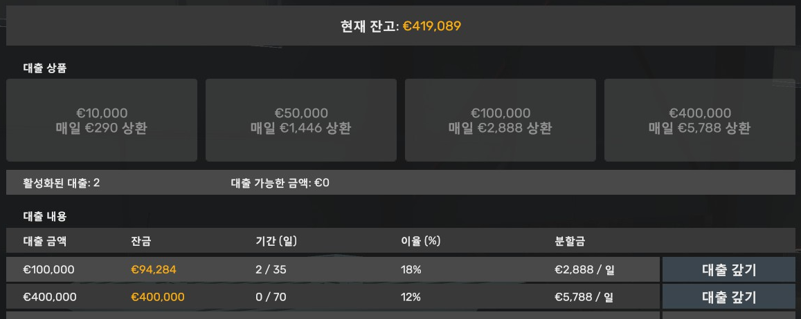 스킬 이것저것 찍어서 그런지 이제는 제가 실수만 안한다면 50만 유로를 갚은 것은 크게 문제가 없지 않을까 싶습니다.