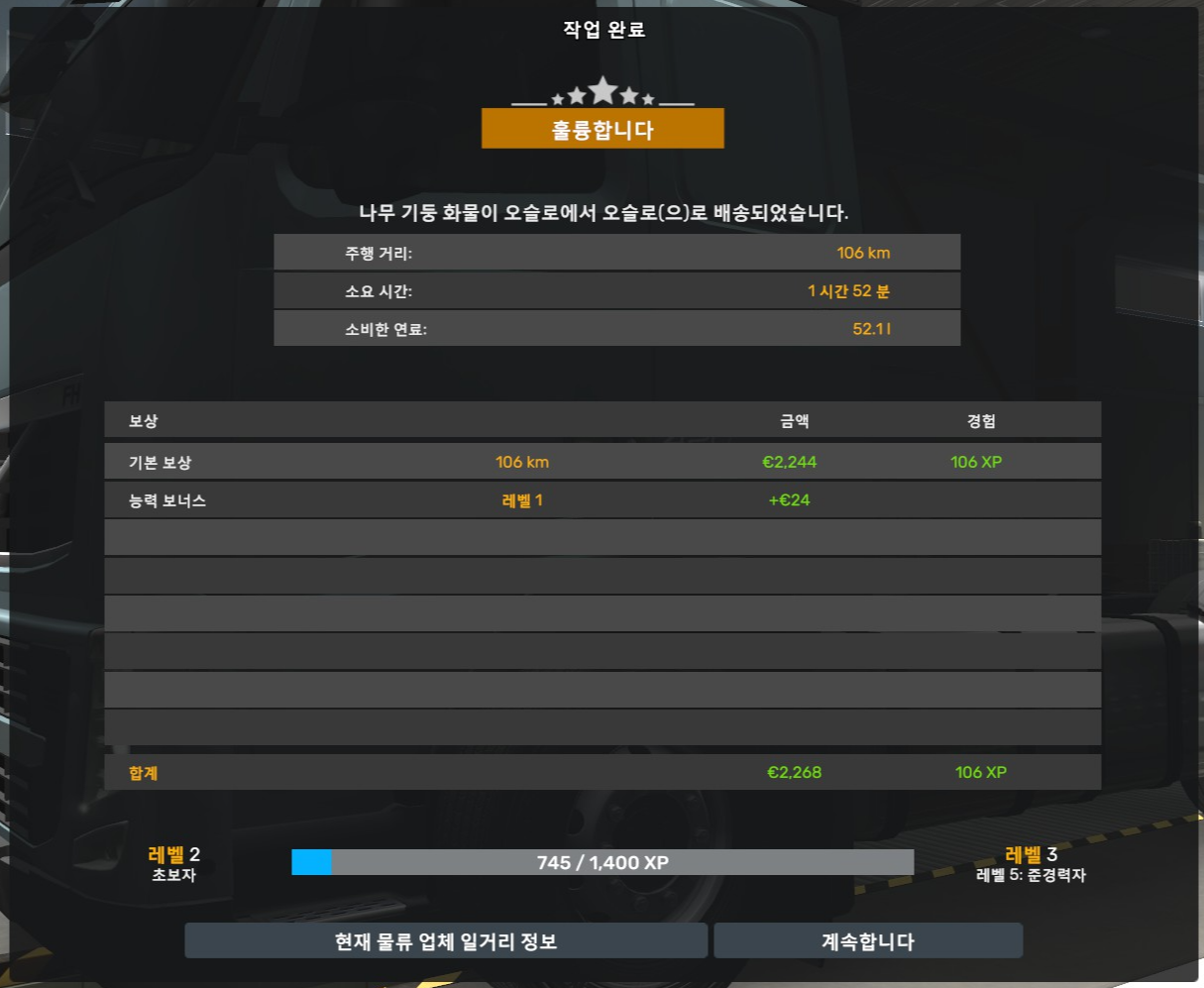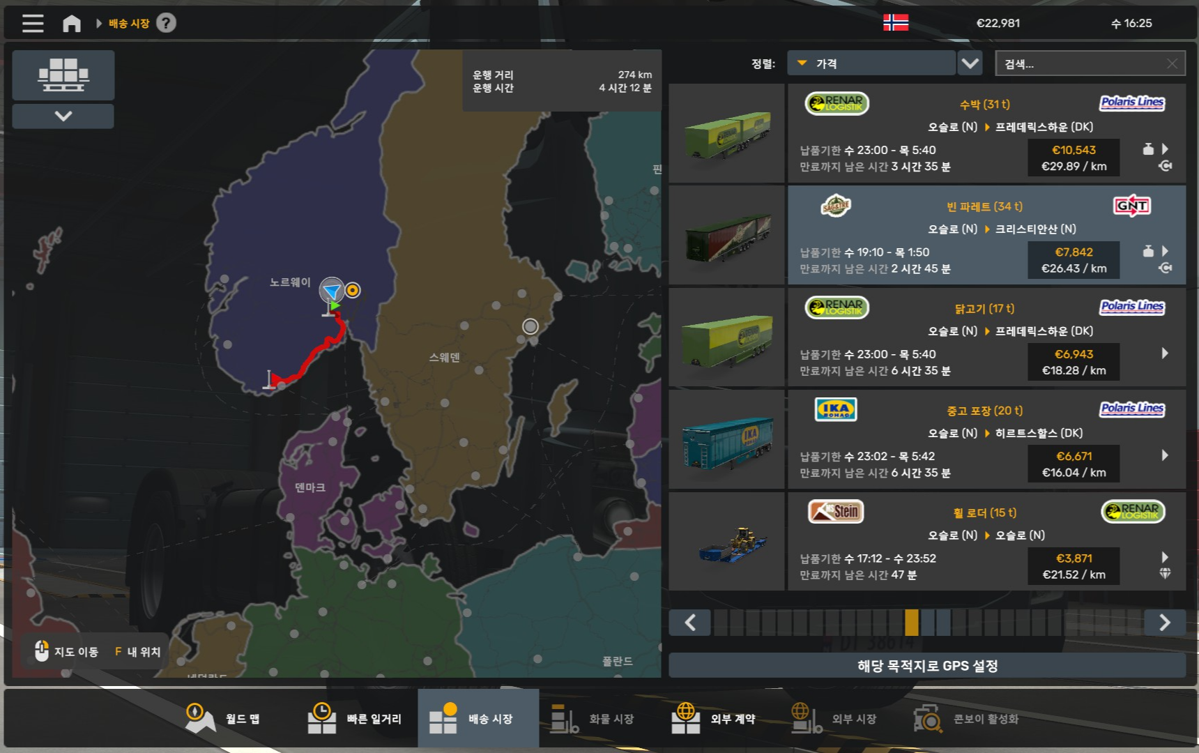 장거리 스킬을 찍어서 그런지 이제 노르웨이의 오슬로 외에도 다른 지역으로도 갈 수 있게 됐더라고요? 그래서 그런지 화물 가격도 올라갔네요.