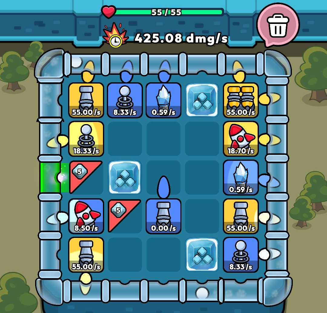 그냥 판 하나로 입구 최대한 틀어막고 타워를 최대한 외곽에 배치하는 게 제일 강하더라고요? 약간 창의적인 배치가 있을 줄 알았는데 이점은 조금 아쉽더라고요.