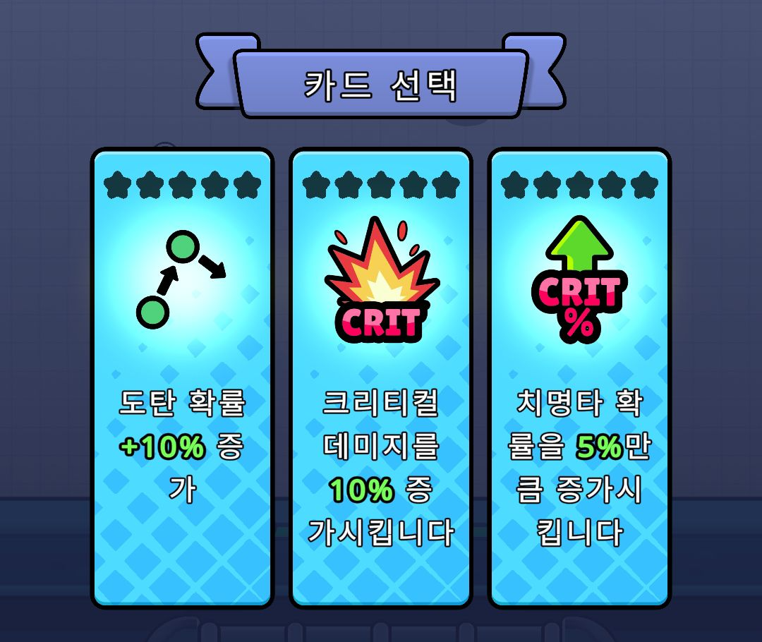 그렇게 적들을 계속 잡다보면 카드를 선택할 수 있는데요. 익숙한 삼지선다입니다. 각 상황에 필요한 능력을 고르면 더 원활하게 진행 가능합니다.