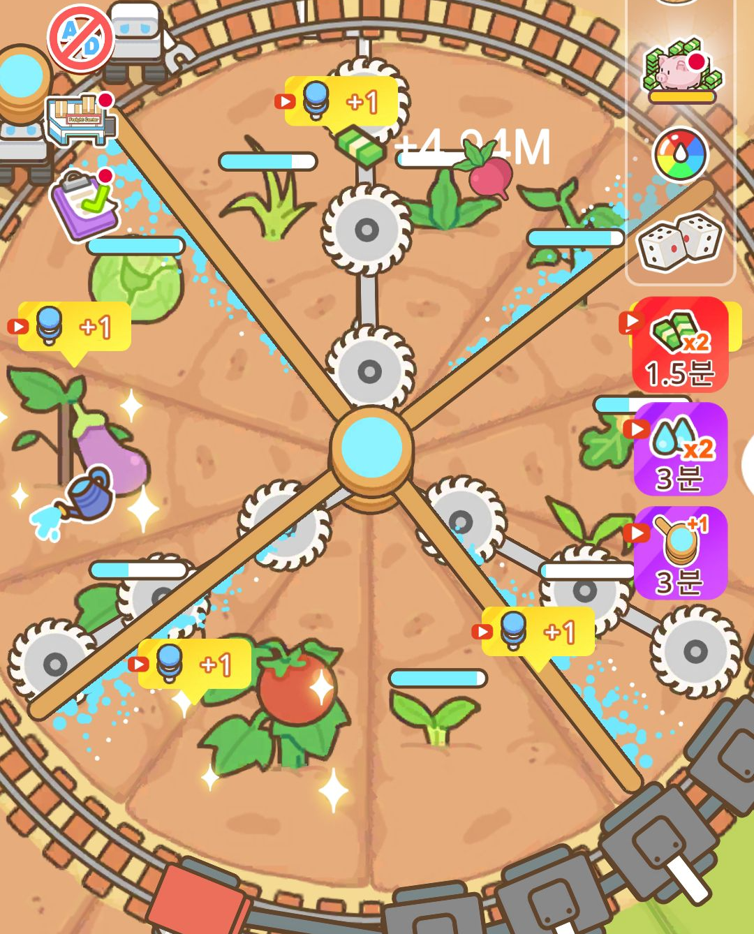 원형으로 된 농경지에서 작물을 수확하는 방치형 게임입니다.