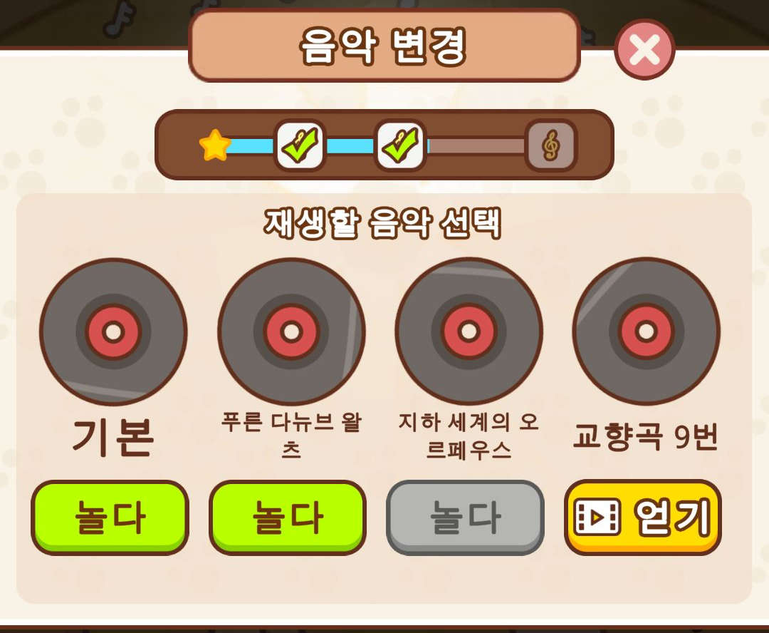 그리고 연주하는 음악도 변경할 수 있습니다. 제가 막귀라 다른 노래도 그런지는 모르겠는데, 기본 노래는 고양이가 늘어나 악기의 종류가 늘어날 때마다 음악도 조금 더 풍부해지는 느낌이 있더라고요?