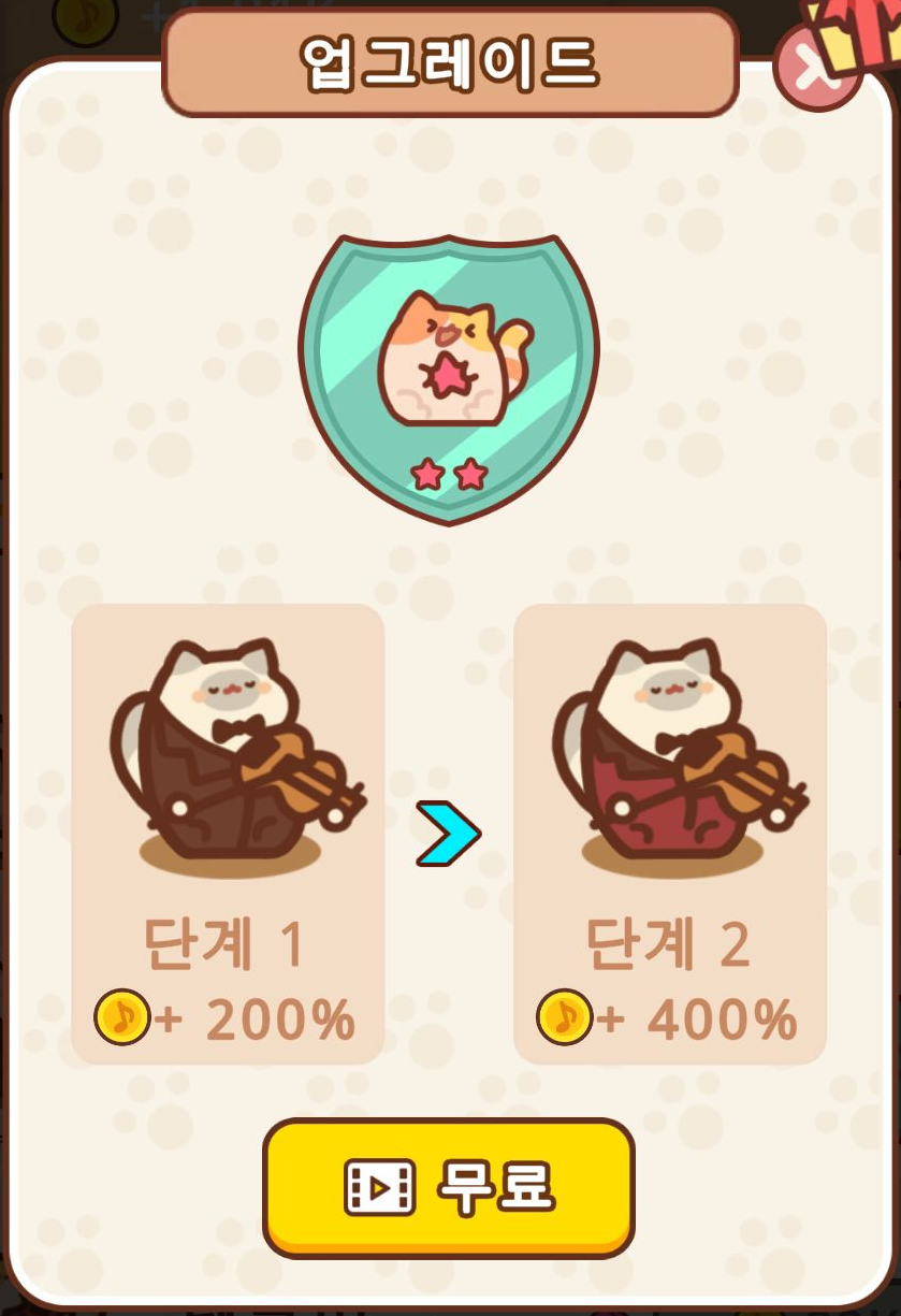 얻은 수익으로는 업그레이드를 할 수 있습니다. 업그레이드를 통해 레벨을 쌓으면 이렇게 고양이의 수가 더 늘어나게 되는데요.