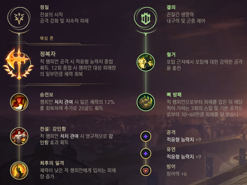 붙어서 딜을 넣는 가렌 특성상 정복자 스택 쌓기가 쉬운 편입니다.