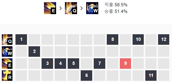 적의 공격을 적당히 맞아주면서 거리가 되면 Q-E로 공격하고 W로 적당히 빠지는 것이 핵심입니다.