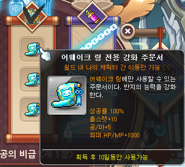 어웨이크 링 전용 강화 주문서는 천공의 비급에서 올릴때 마다 한 장을 주고