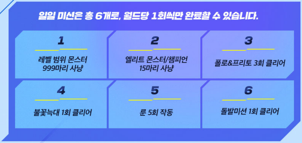 일일미션은 6개가 있는데, 모두 다 사냥 관련입니다.