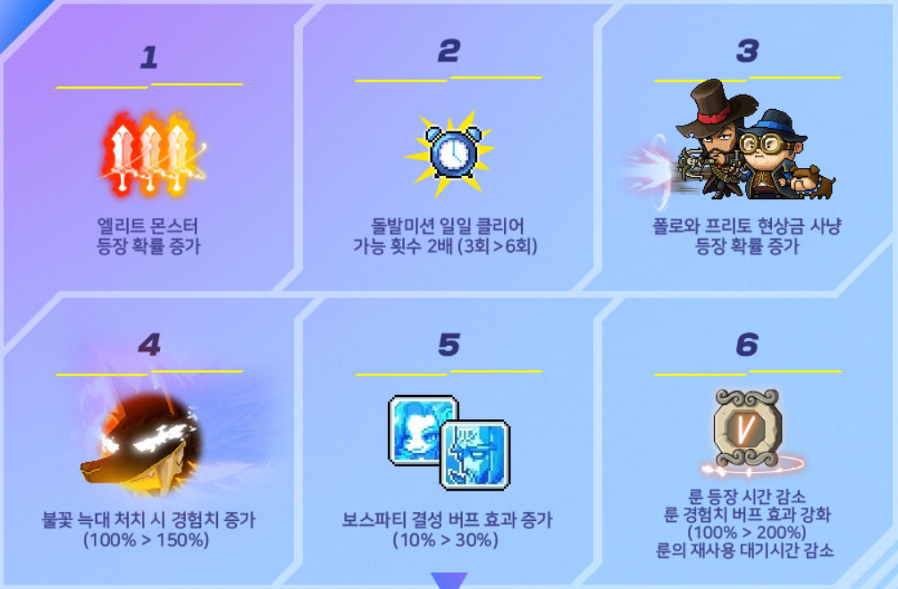 경험치 증가, 횟수, 몬스터 등장 확률 등등